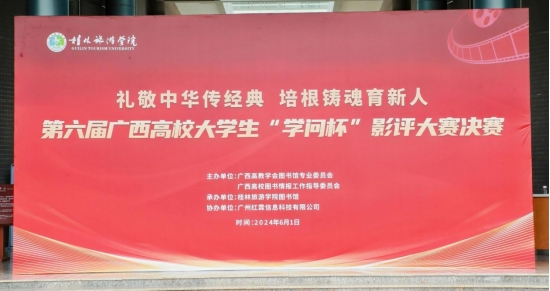 6月1日“礼敬中华传经典 培根铸魂育新人”为主题的第六届广西高校大学生“学问杯”影评大赛决赛在桂林旅游学院图书馆银桂厅成功举行。本次大赛由广西高教学会图书馆专业委员会和广西高校图书情报工作指导委员会主办,桂林旅游学院承办,广州红霖信息科技有限公司协办。