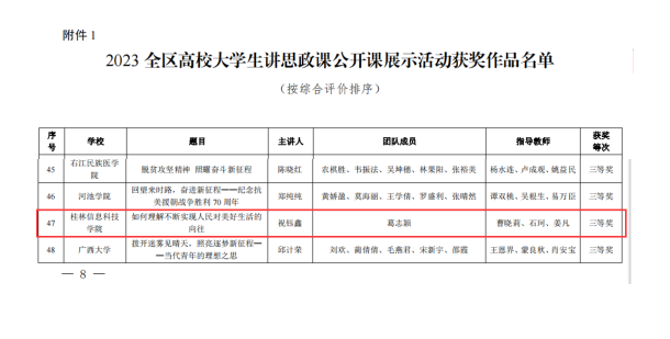 据悉,本次活动自今年6月启动以来,经各高校推荐,教育厅组织专家评审,认定全区高校大学生讲思政课公开课展示活动优秀作品108件,其中,本科组一等奖7件、二等奖15件、三等奖31件;高职组一等奖7件、二等奖15件、三等奖33件。认定“我心中的思政课”全区高校大学生微电影展示活动优秀作品103部,其中,本科组一等奖6部、二等奖11部、三等奖37部;高职组一等奖6部、二等奖10部、三等奖33部