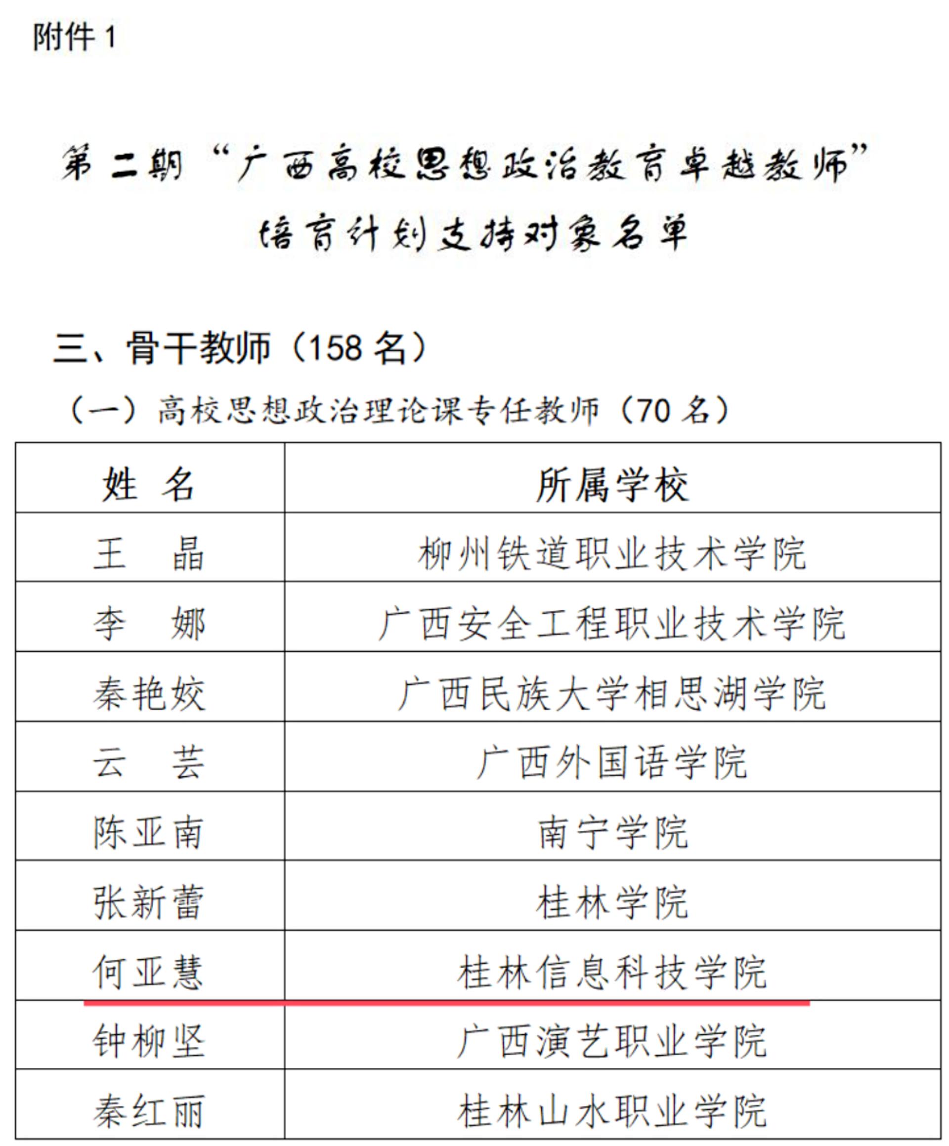 近日,自治区教育厅公布了第二期“广西高校思想政治教育卓越教师”培育计划支持对象“中青年骨干教师”名单,beat365马克思主义学院教师何亚慧成功入选。