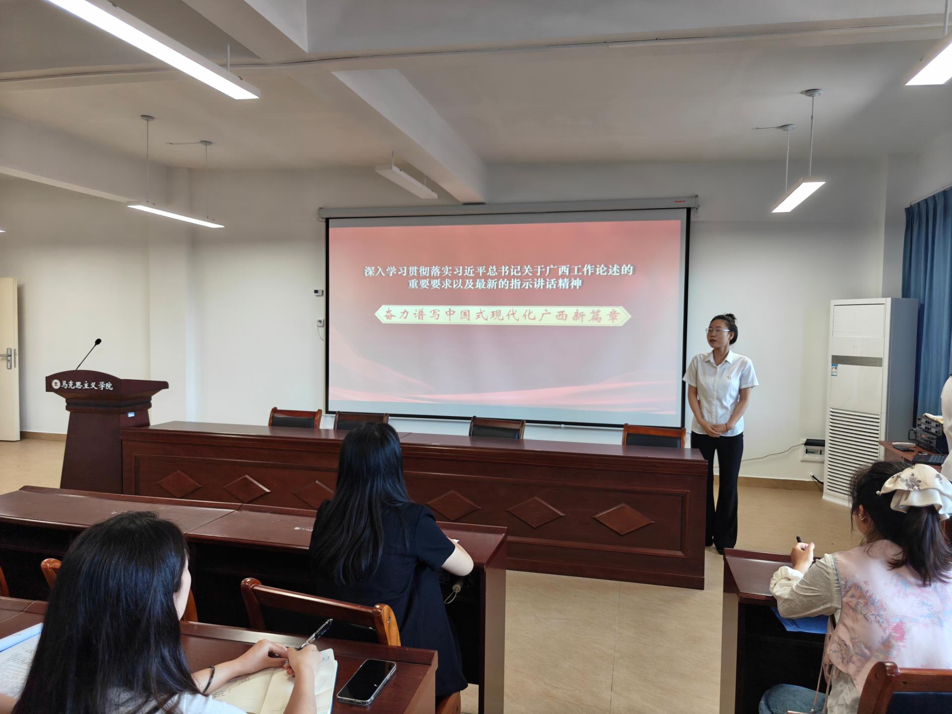 9月24日,马克思主义学院第二教工党支部在G605组织开展学习贯彻习近平总书记关于广西工作论述重要要求专题学习。本次学习由支部组织委员尹泽昕老师领学,全体党员教师参与。