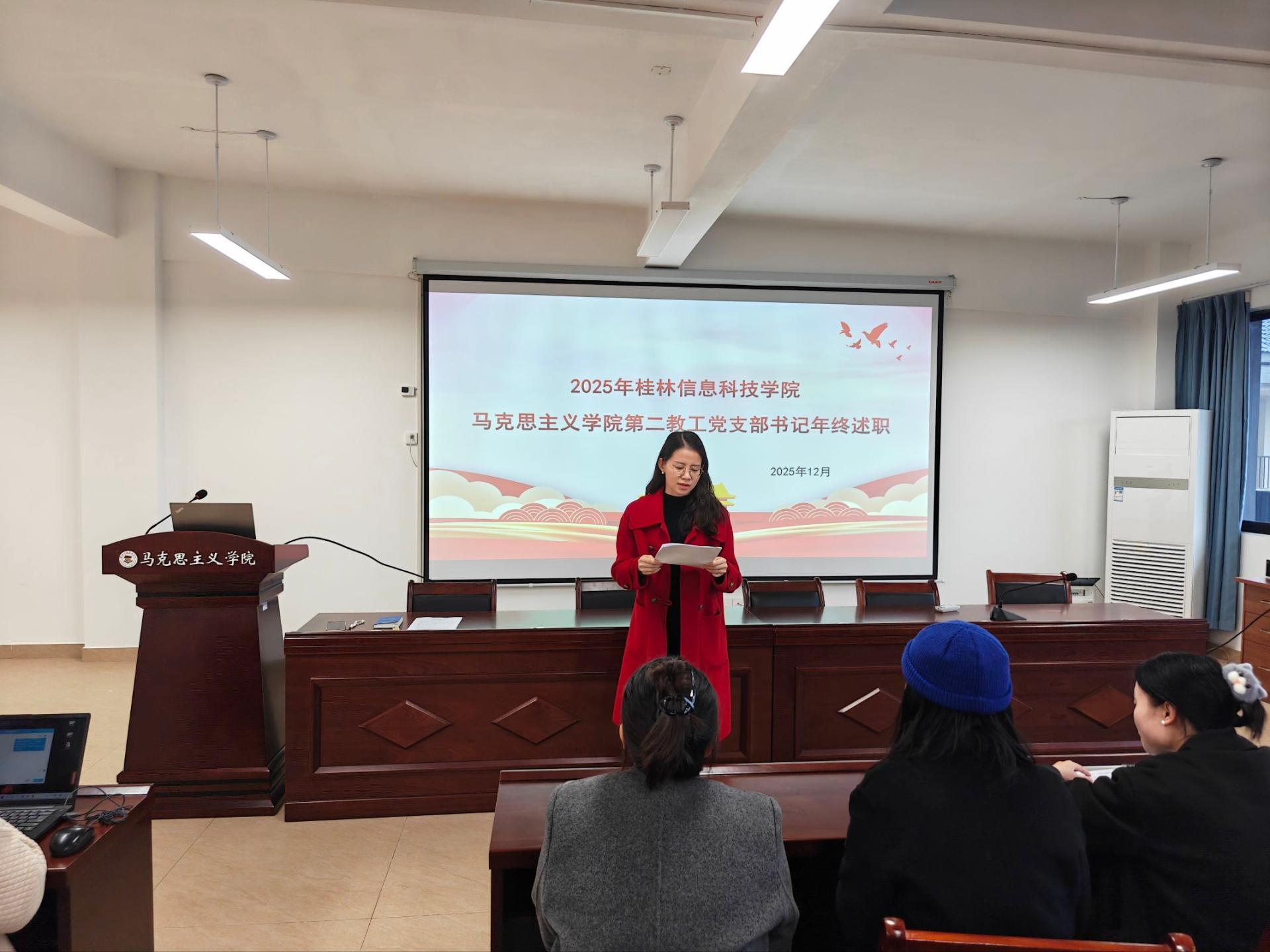 12月12日,马克思主义学院第二教工党支部在G605会议室召开2025年度党支部书记述职评议会。支部书记何亚慧同志就年度党建工作情况向全体党员述职。学院党总支委派委员剌啸媛同志到会指导监督,支部全体党员参会。
