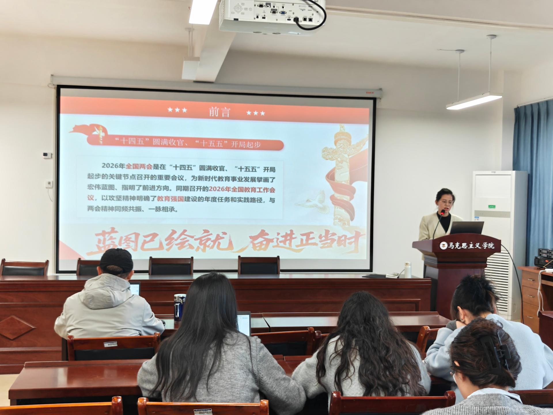 为深入学习领会全国两会精神,准确把握教育发展的新部署新要求,3月26日,马克思主义学院第二教工党支部在G605会议室开展“深学细悟两会精神 勇担教育育人使命”专题学习,党支部书记何亚慧主持并作领学,支部全体党员参与。