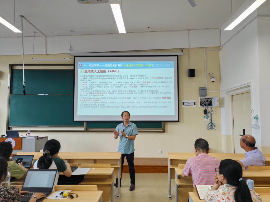 郭庆教授深入浅出地介绍了人工智能发展历史,详细讲解了生成式人工智能大模型的基本技术原理,并且以“文心一言”、“豆包”、“讯飞星火”等模型,讲授如何扩大知识工作者的能力范围,提升学习、工作效率,使生活变得更加轻松;其次简要介绍了大语言模型的原理与发展路径,并从文本、图片、语音、视频、编程等不同信息类型,介绍了生成式AI对知识工作者带来的显著影响;最后带领老师们展望了生成式AI的发展趋势,讨论了普通用户应如何更好把握这一重要科技浪潮带来的机遇,并应对同时带来的挑战。郭庆教授深入浅出的讲解通俗生动,不时抛出一些问题启发老师们思考,并在提问互动环节与各位老师亲切交流。