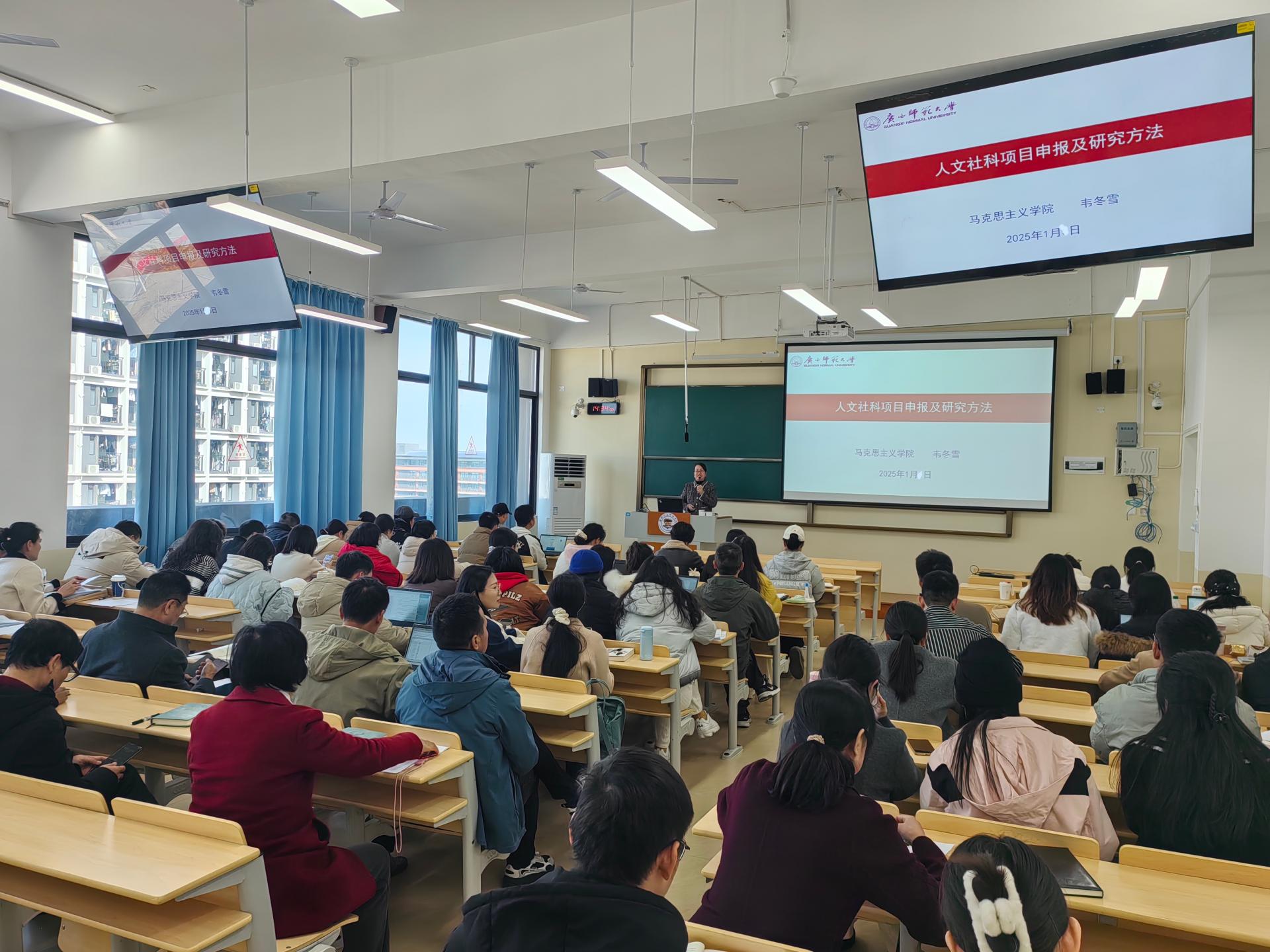 2025年1月6日,马克思主义学院在C511教室组织开展了“人文社科项目申报及研究过程”学术讲座。本次讲座由广西师范大学马克思主义学院韦冬雪教授主讲,马克思主义学院全体教师参加。