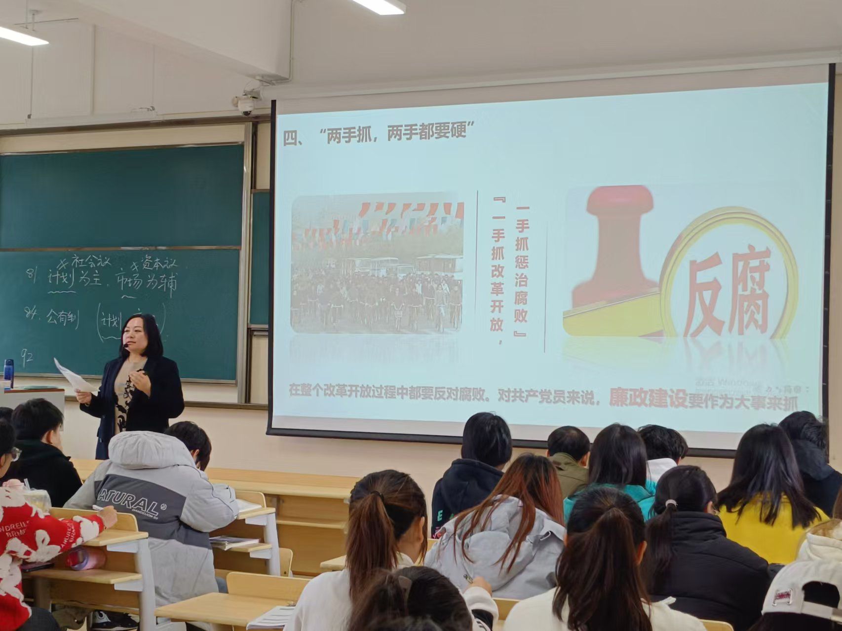 课上,剌啸媛老师依托毛泽东思想和中国特色社会主义理论体系概论课程以邓小平理论中“两手抓两手都要硬”的重要思想为指引,以一个个鲜活的案例为内容让学生们深刻领悟到廉洁自律的重要性。同时,通过组织学生开展小组讨论,分析典型案例,引导同学们树立正确的价值观和道德观。