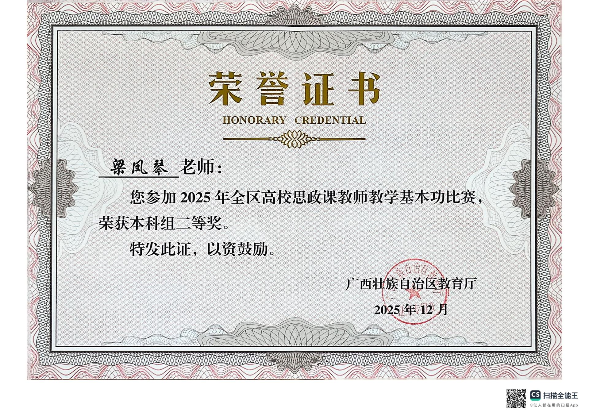 在教学工作中,梁凤琴老师始终践行“以学生为中心”理念,致力于教学方法的持续创新与精准化地因材施教,课堂教学质量显著提升,连续三年教学评价名列前茅。2025年荣获广西壮族自治区“精彩一课”高校思政课教师教学基本功比赛本科组二等奖、校级“优秀课堂”评比二等奖、教学能手大赛优胜奖等多项教学奖励,充分展现了扎实的教学功底。