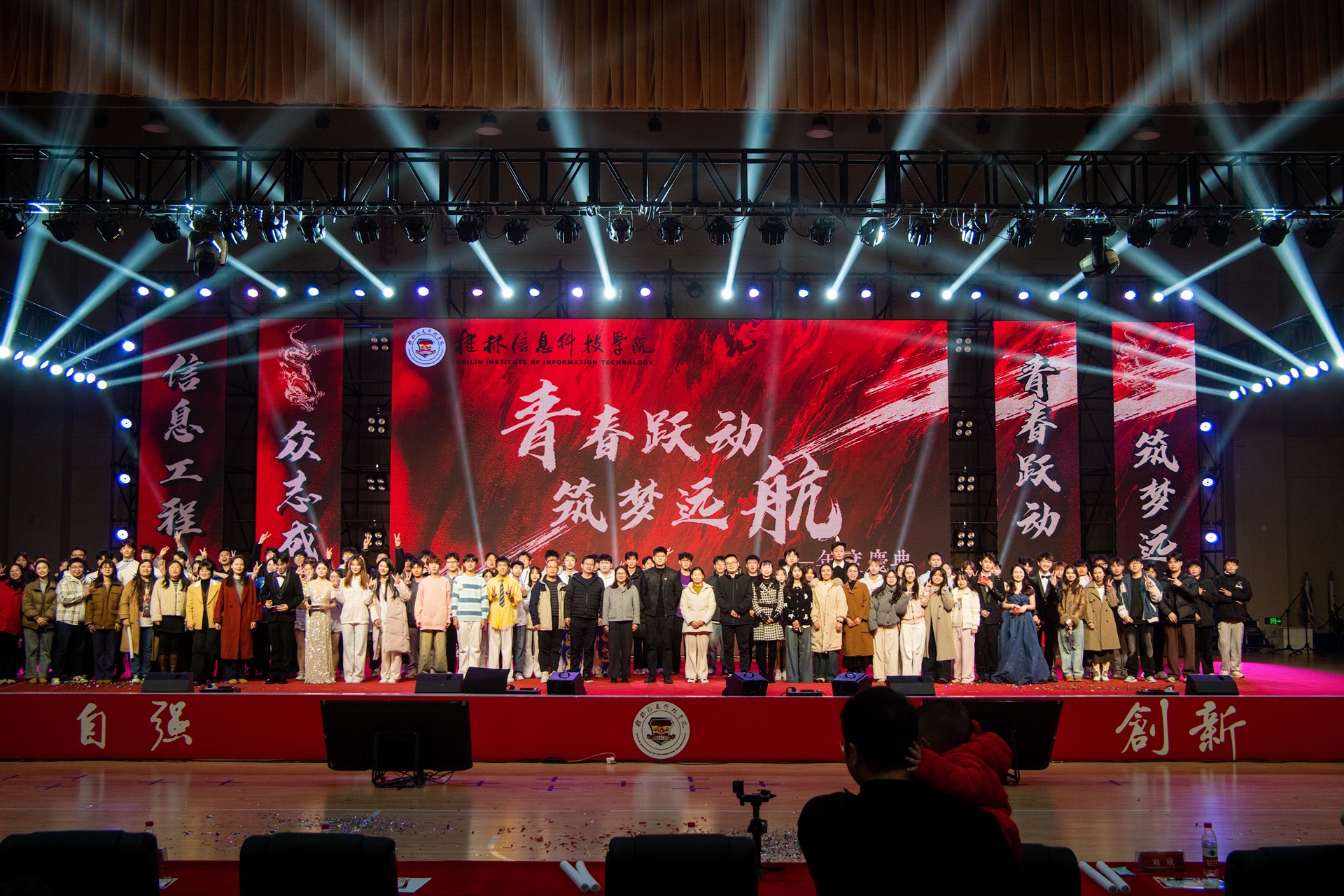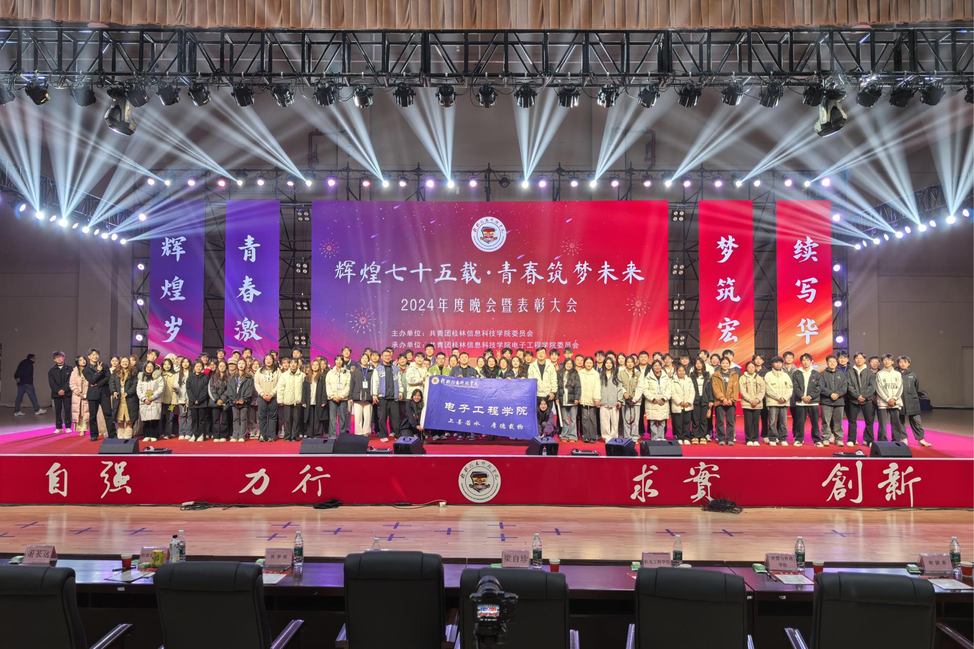 12月21日晚,电子工程学院于行健楼举行“辉煌七十五载,青春筑梦未来” 2024年度晚会暨表彰大会,学院党委书记梁自珍、学工办负责人以及各学院团委老师出席晚会。晚会分为“青春·追逐梦启航”、“自由·山河壮志行”、“未来·追寻中国梦”三个篇章。歌曲、小品、舞蹈依次亮相,璀璨夺目、表演精湛,赢得了台下师生的连连称赞和阵阵热烈的掌声。在晚会期间,穿插举行了2024年度表彰大会,隆重表彰了在2024年度荣获学生典范奖、学...