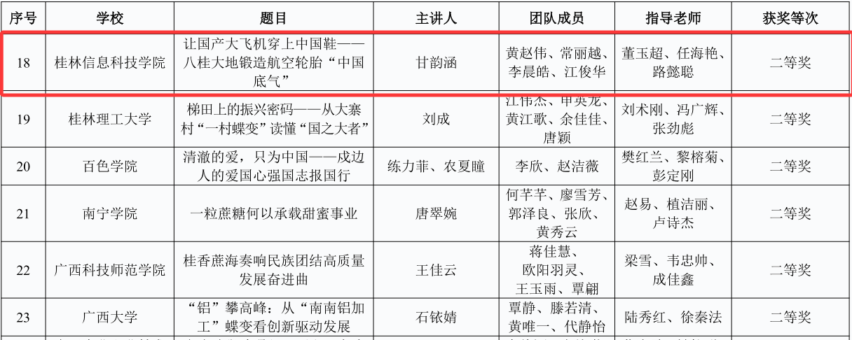 近日,由自治区党委宣传部、自治区党委教育工委、自治区教育厅联合主办的全区高校大学生讲壮美广西“大思政课”推选展示活动圆满落幕。beat365师生团队作品《让国产大飞机穿上中国鞋——八桂大地锻造航空轮胎“中国底气”》从全区187项参赛作品中脱颖而出,荣获二等奖。
