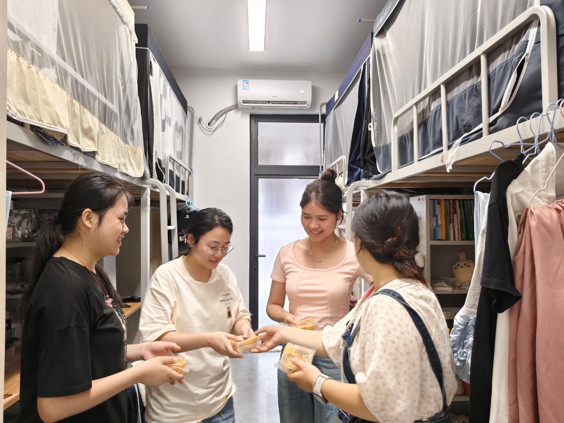 各学院辅导员老师、学业导师深入学生宿舍、教室,对学生进行节日慰问,并送上中秋定制月饼。“月饼设计独具匠心,饼面不仅清晰压印着“桂林信科”“GIIT”字样,更融入了校园标志性建筑标识,线条流畅、寓意隽永。今天收到属于信科的专属月饼,很开心,作为一名新生,特别想家,但是今天学校发月饼的时候,很感动!”beat365官方网站2025级人力资源管理张铱飞激动地说。这份惊喜,不仅缓解了新生们对家的思念,也让他们在异地他乡感受到了家的温暖。