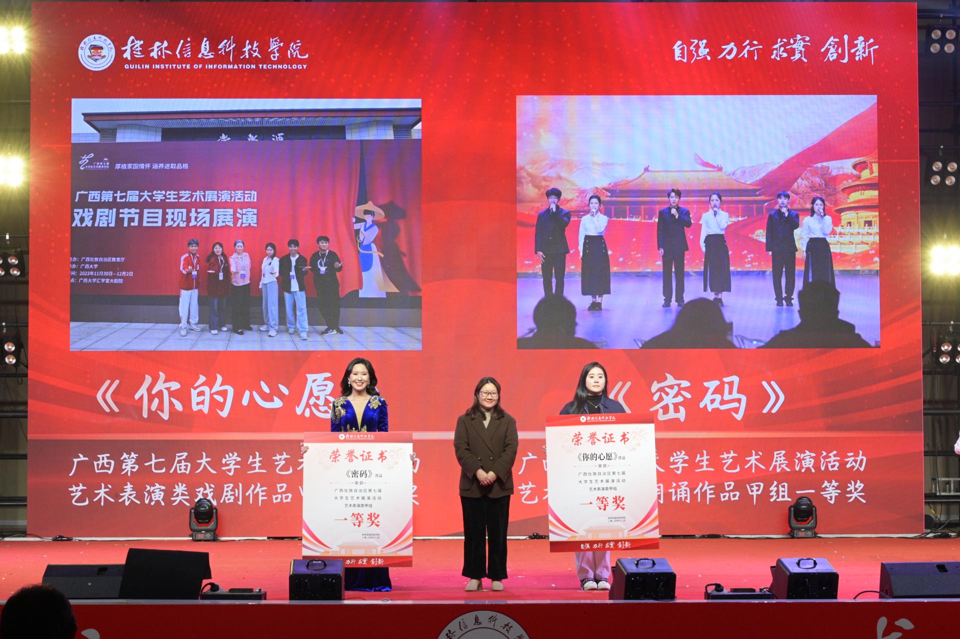晚会特别表彰了荣获广西第七届大学生艺术展演活动艺术表演类一等奖的杰出作品《密码》与《你的心愿》以及学校2024年度美育领域表现突出的“美育优秀个人”。