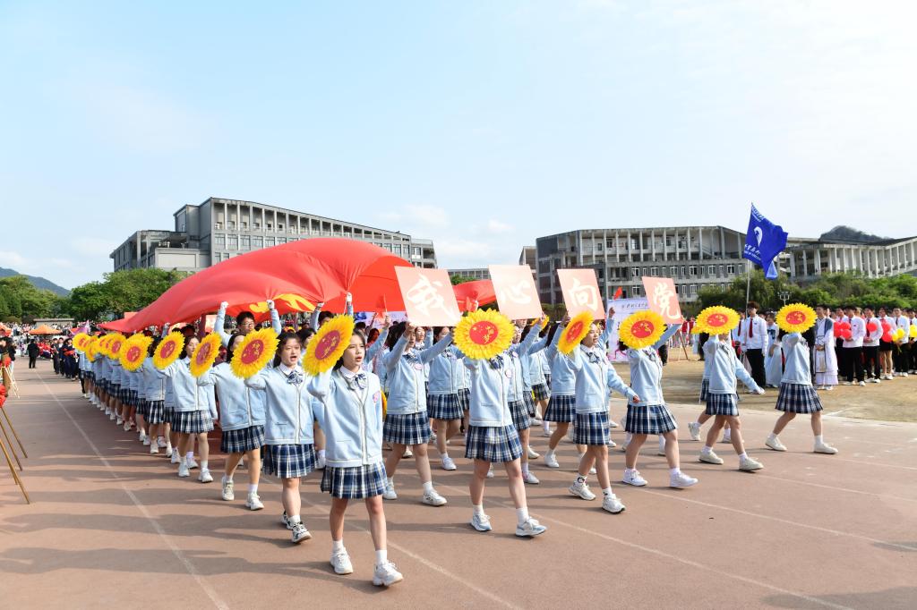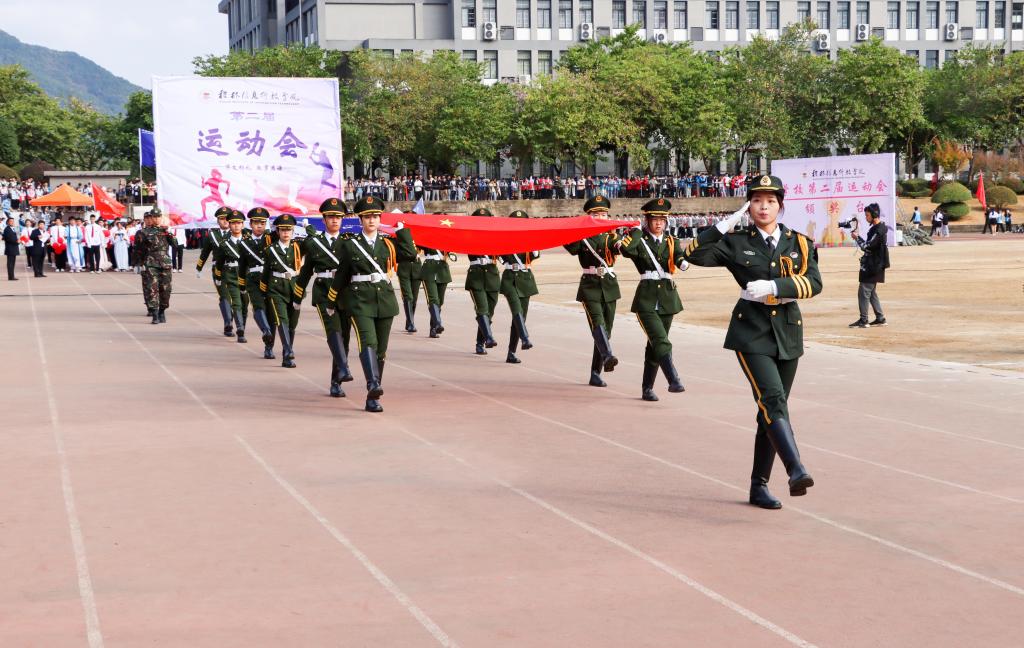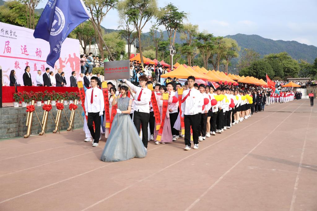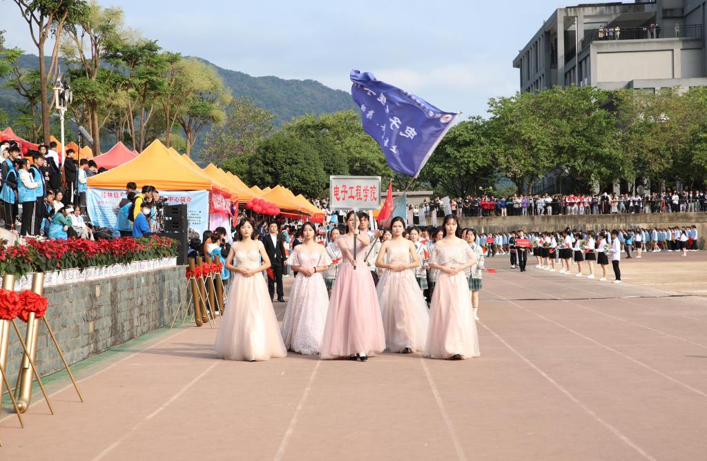 外贸与外语学院学生团队啦啦队为现场观众带来热情活力、青春朝气的舞蹈瞬间将开幕式点燃。升国旗仪式后,伴随着主持人的开场和激昂的《运动员进行曲》,国旗、校旗、会旗依次进场,各方阵师生带着各自学科特色优势迈着矫健的步伐依次入场,充分展示了信科师生“献礼二十大 拼搏向未来”的精神面貌。