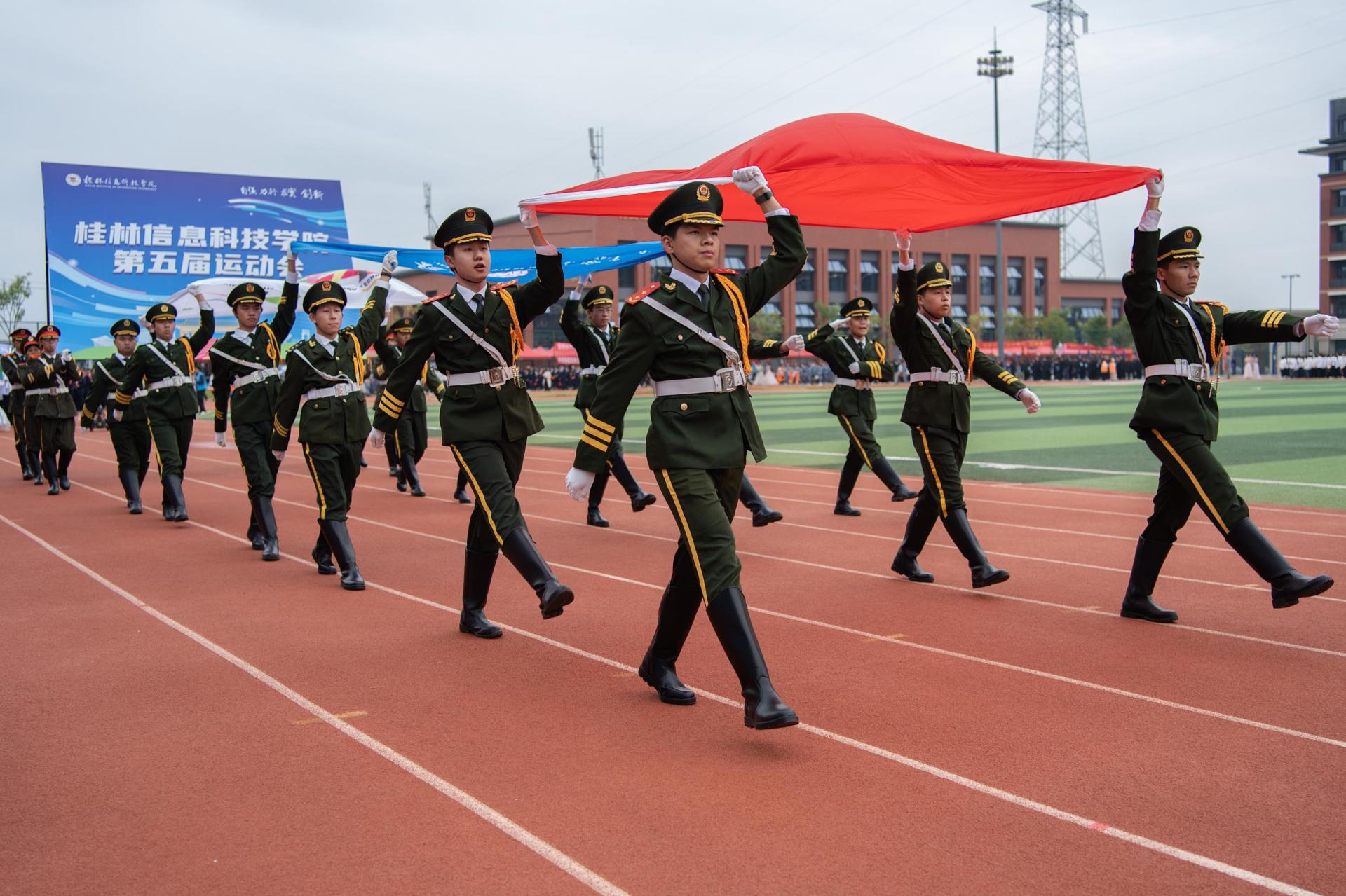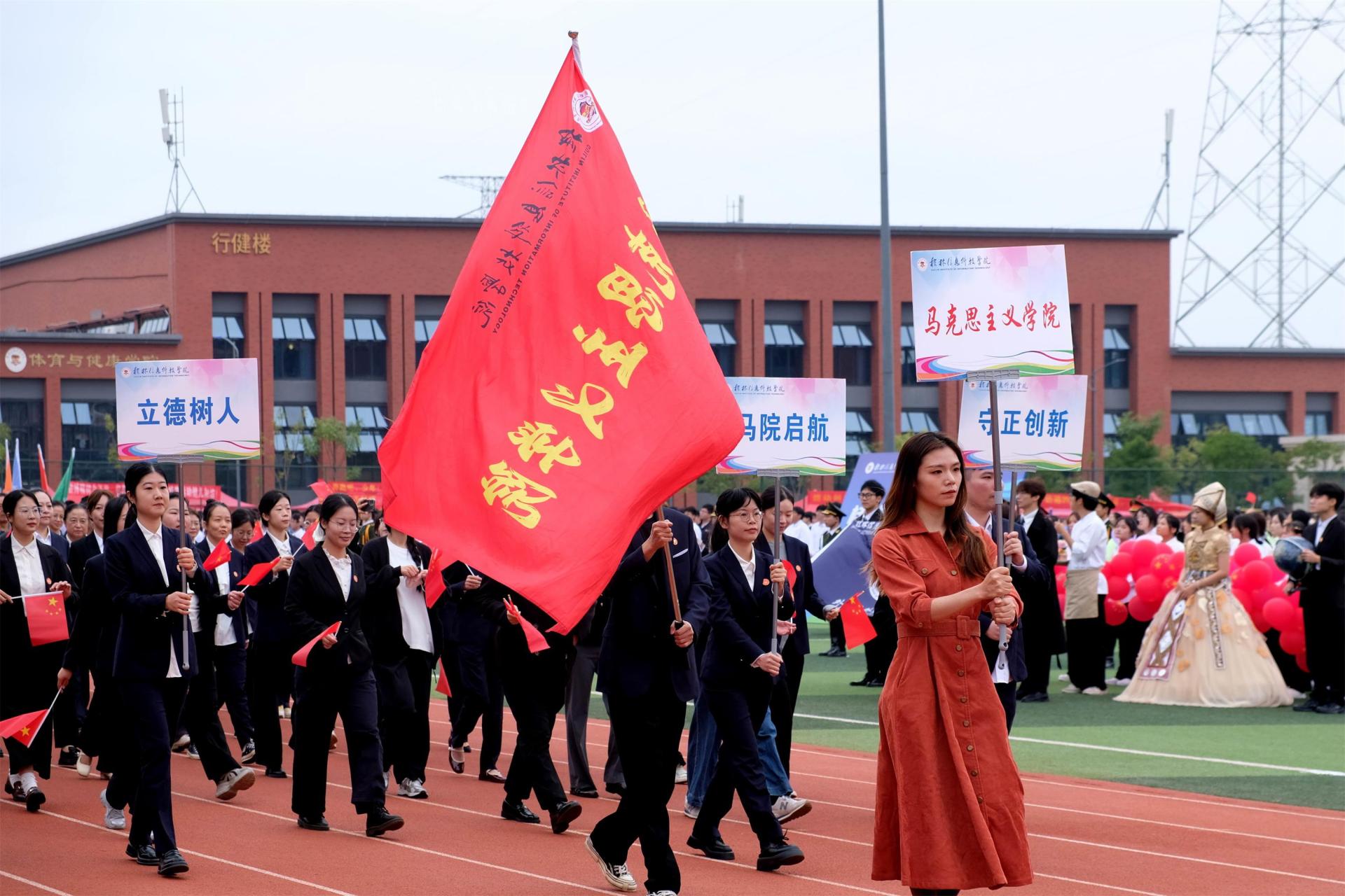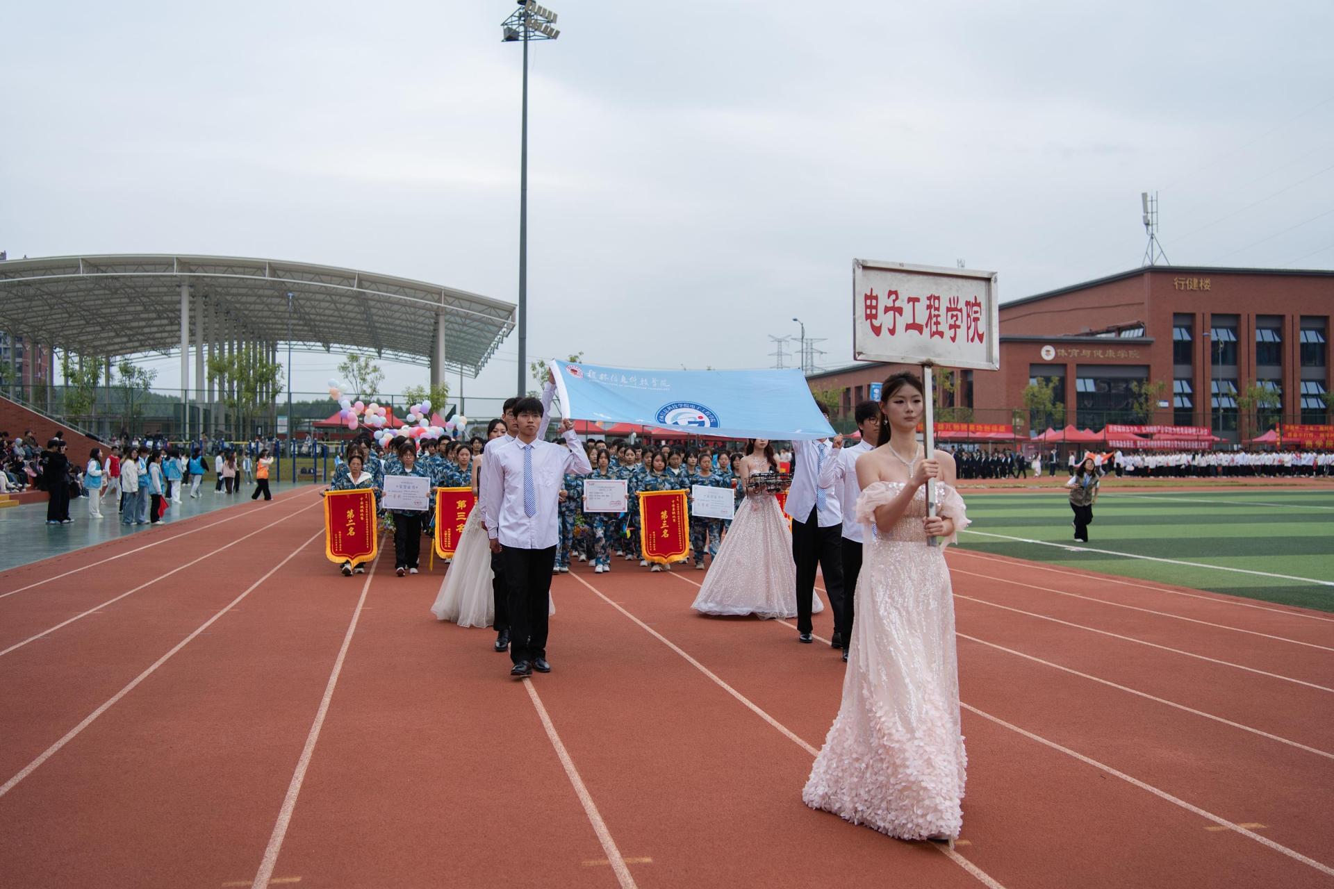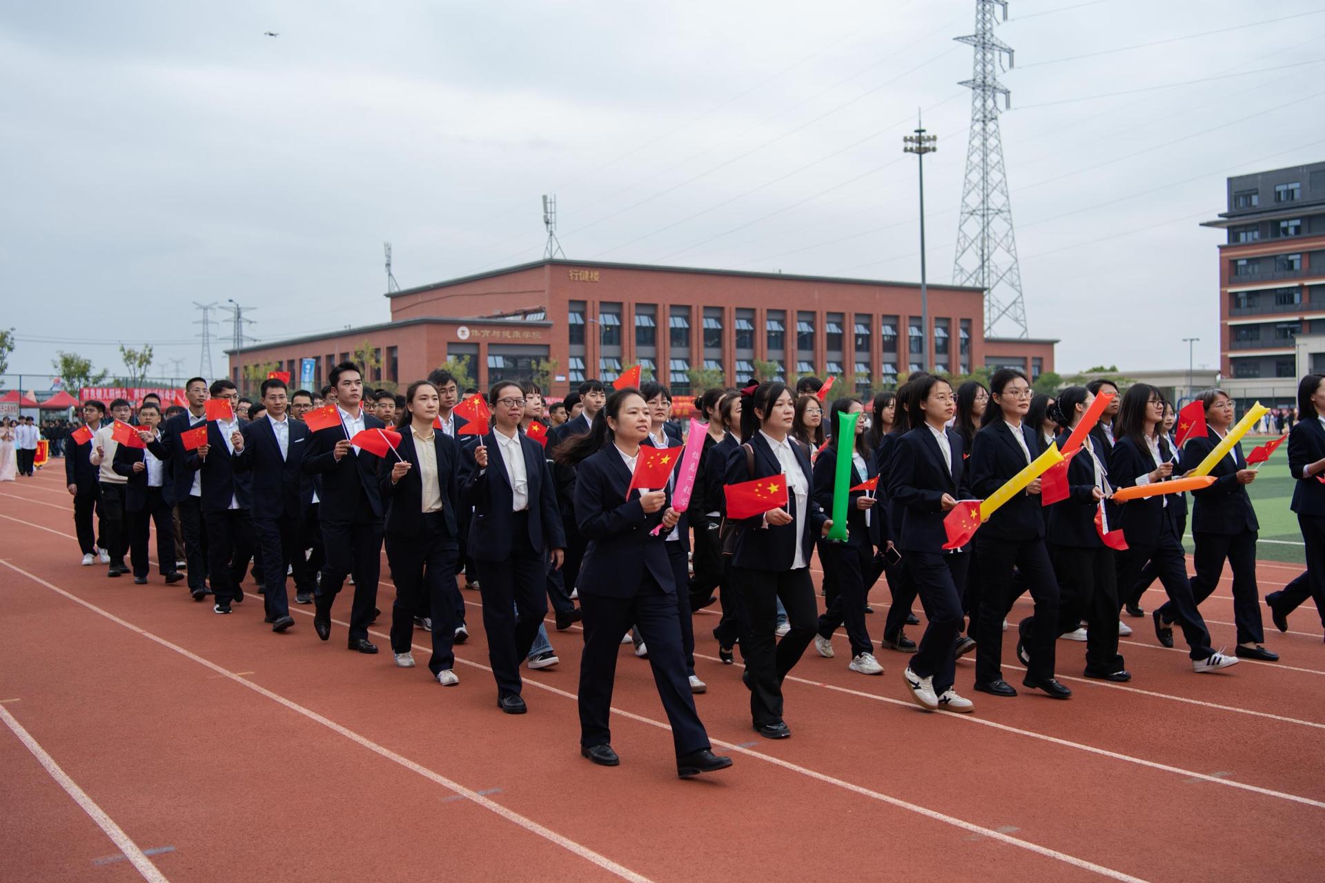 随后,国旗护卫队、信息工程学院、电子工程学院等师生代表方队依次登场,意气风发地走过主席台接受检阅,充分展现了学校各学科专业特色与师生们的良好的精神风貌。