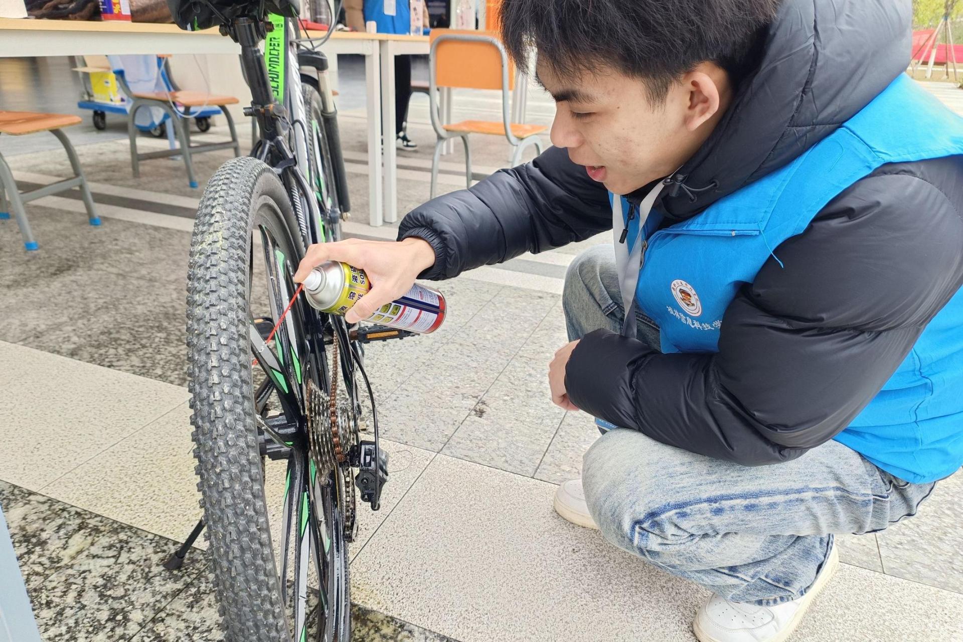 活动现场,机电工程学院志愿者们结合专业特长,为师生提供自行车检修服务,并开设“骑行安全小课堂”。从刹车灵敏度检测、链条润滑保养到轮胎气压调整,志愿者们逐一讲解操作要点,并现场演示更换内胎、调试变速器等实用技能。同学们纷纷驻足学习,踊跃提问,志愿者们耐心解答,手把手指导操作技巧。活动期间,共为师生维修自行车60余辆,发放《自行车日常维护手册》百余份,切实解决了校园骑行中的实际问题。