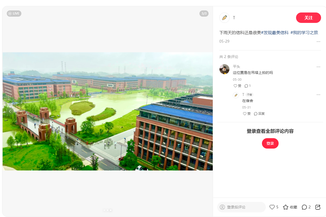 活动中,学生依托专业特长,聚焦校园风光、校园生活、校园学习三个维度,将设计思维与传播技巧融入创作。依托抖音、小红书平台,学生围绕主话题“发现最美信科”,分话题“校园打卡”“校园生活日记”“我的学习之旅”等,通过拍摄视频、发布图文等形式,进行校园形象宣传。截至目前,小红书话题浏览量已达1.6万次,讨论量484条;抖音平台播放量突破33.4万次,多件作品因创意剪辑与内容质量登上平台推荐页,吸引校内外网友关注。