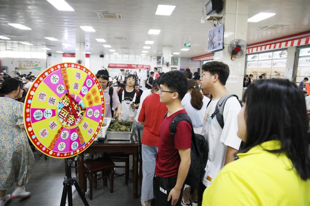 信科食堂将现代元素融入传统文化,通过寓教于乐的方式,搭建“服务育人”的活动平台,将活动分为“光盘有礼”、“传统投壶”、“体验包粽子”三个模块,师生凭就餐“光盘”或命中投壶,即可玩转幸运转盘一次,获得粽子、艾叶香囊、鸡蛋、鲜果等对应的礼品。汉服社团的同学们身着汉服为活动现场助兴,吸引不少师生驻足参与,活动现场热闹欢快。