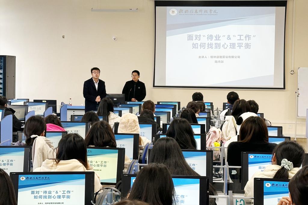 为了帮助我院2024届毕业生适应当前紧张的就业形势,减轻就业方面的心理压力,12月5日,外贸与外语学院开展了一场主题为“面对‘待业’和‘工作’如何找到心理平衡”的就业心理辅导专题讲座。讲座邀请桂林盛驰贸易有限公司总经理、我院优秀校友陆鸿剑主讲,全院学生及相关辅导员参加。陆鸿剑总经理围绕当今社会就业现状、待业的优缺点及心态变化、工作的优缺点及心态变化 、“我”与你们分别如何看待就业、现身说法、心态调试六...