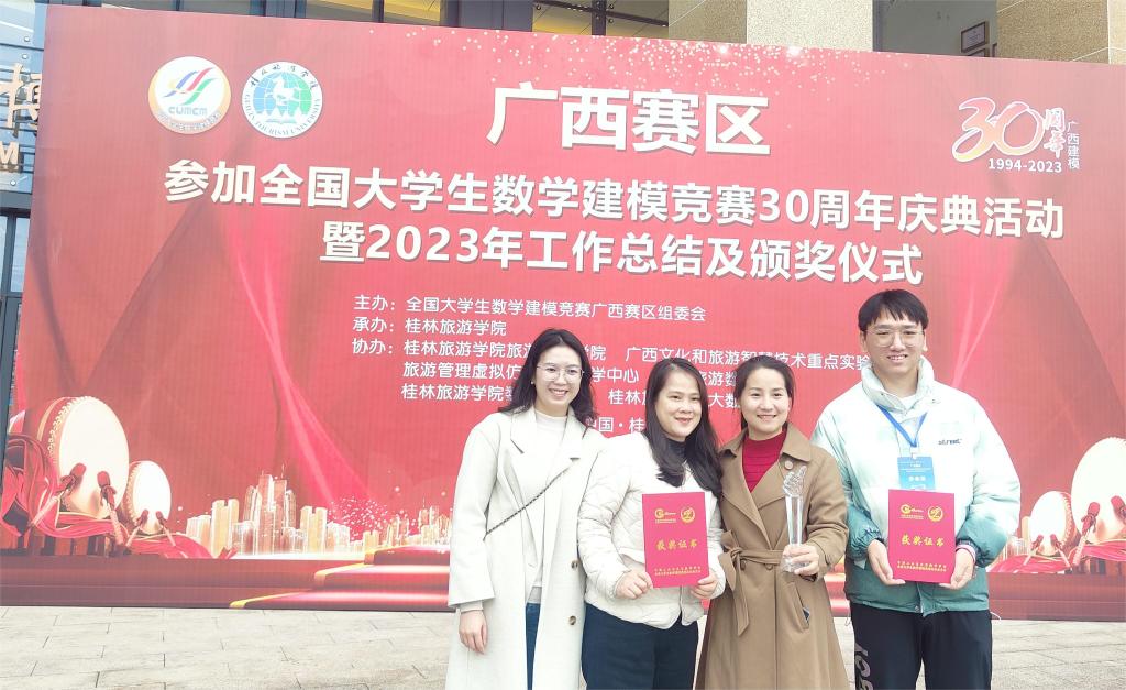 1月12日至14日,全国大学生数学建模竞赛广西赛区成立30周年庆典活动暨2023年工作总结及颁奖仪式在桂林旅游学院举行。数学教研部舒常江、李海珍、刘映伶三位老师与电子信息工程学院学生贺峰参加了此次庆典活动。