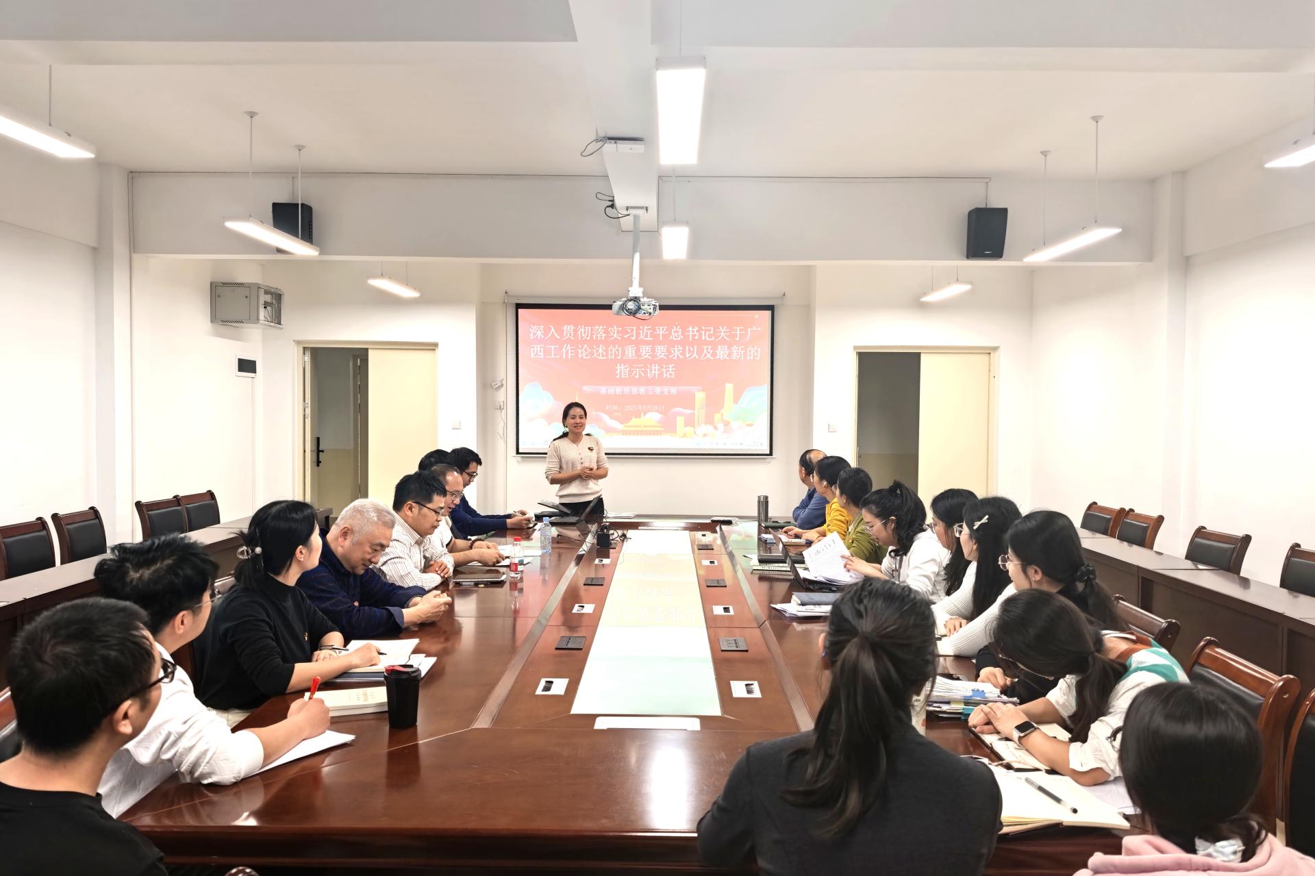 为深入学习贯彻习近平总书记对广西工作系列重要指示精神,将党中央的宏伟蓝图与基层教育实践紧密结合,10月17日下午,基础教研部教工党支部在汇通楼H504会议室召开专题学习会,集中学习习近平总书记关于广西工作论述的重要要求及最新指示讲话精神。会议由基础教研部教工党支部书记刘映伶主持,支部全体党员参会。