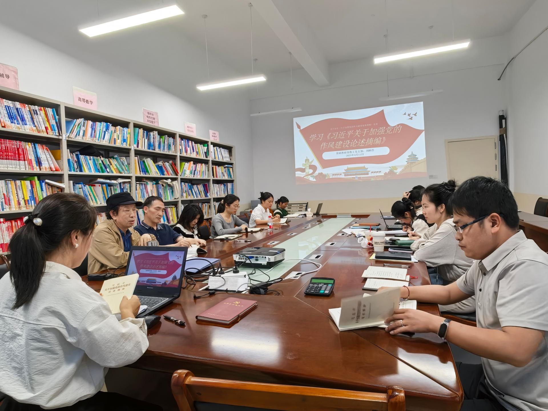 4月11日,基础教研部教工党支部在博文楼F525会议室开展专题党课:深入学习《习近平关于加强党的作风建设论述摘编》,本次党课由党支部书记刘映伶主讲,全体党员参加。