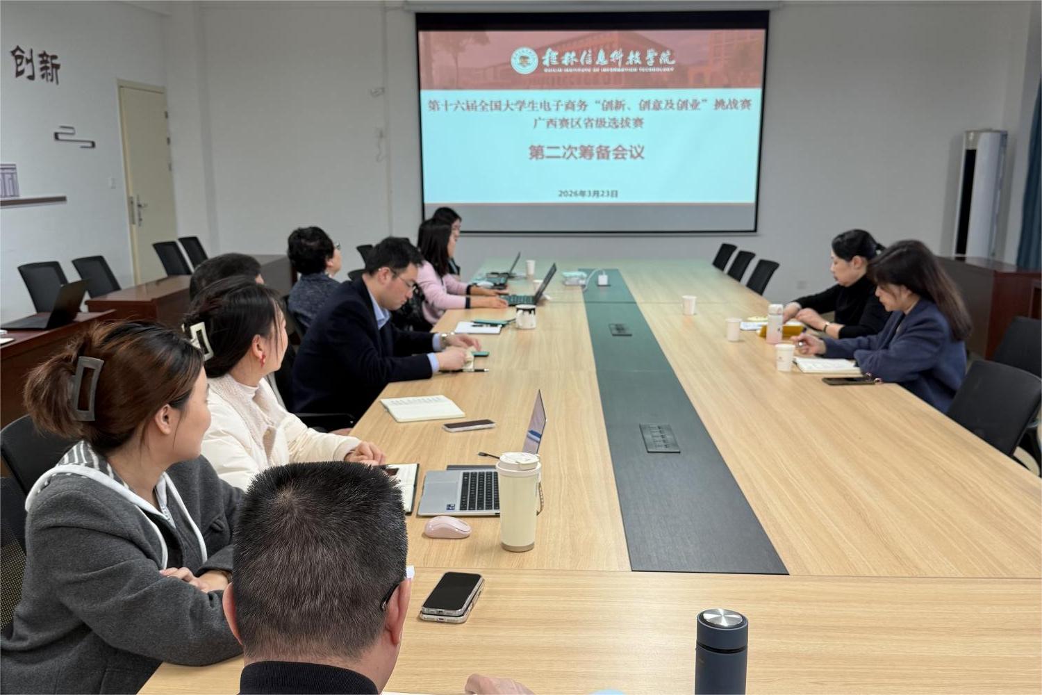 为扎实推进第十六届全国大学生电子商务“创新、创意及创业”挑战赛广西赛区省级选拔赛筹备工作,确保赛事平稳有序、高效开展,3月23日,商学院在汇通楼H621会议室召开第二次筹备工作会议。罗捷副校长出席会议,商学院领导班子全体成员参加会议,共同细化落实赛事各项筹备细节。