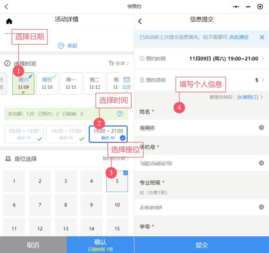 选择预约日期、时段、座位信息,点击确认并根据要求完善个人信息后提交预约。