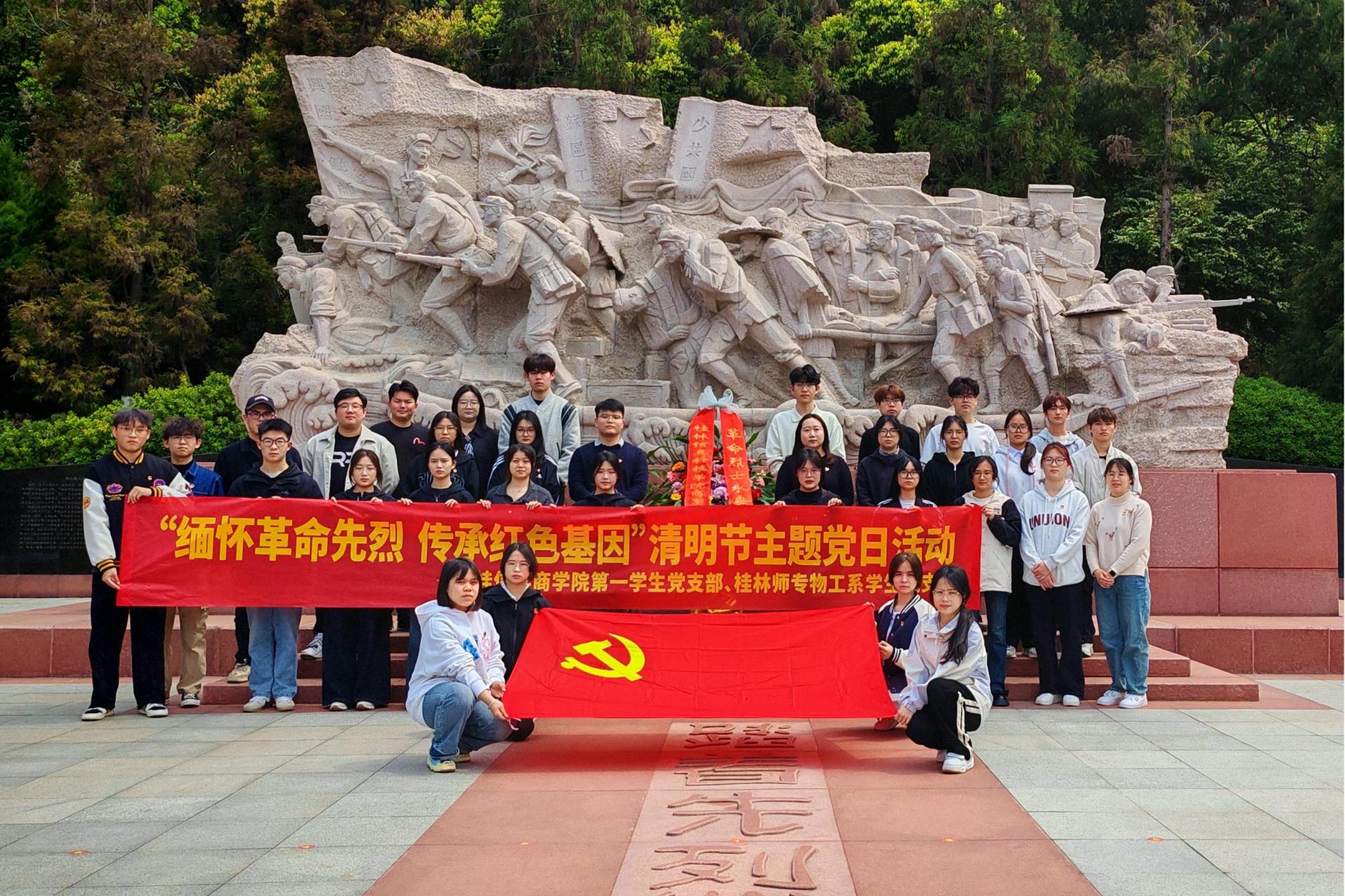 为缅怀革命先烈,传承红色基因,厚植家国情怀,4月3日,商学院第一学生党支部与桂林师专物工系学生党支部联合开展了“缅怀革命先烈 传承红色基因”清明节主题党日活动。