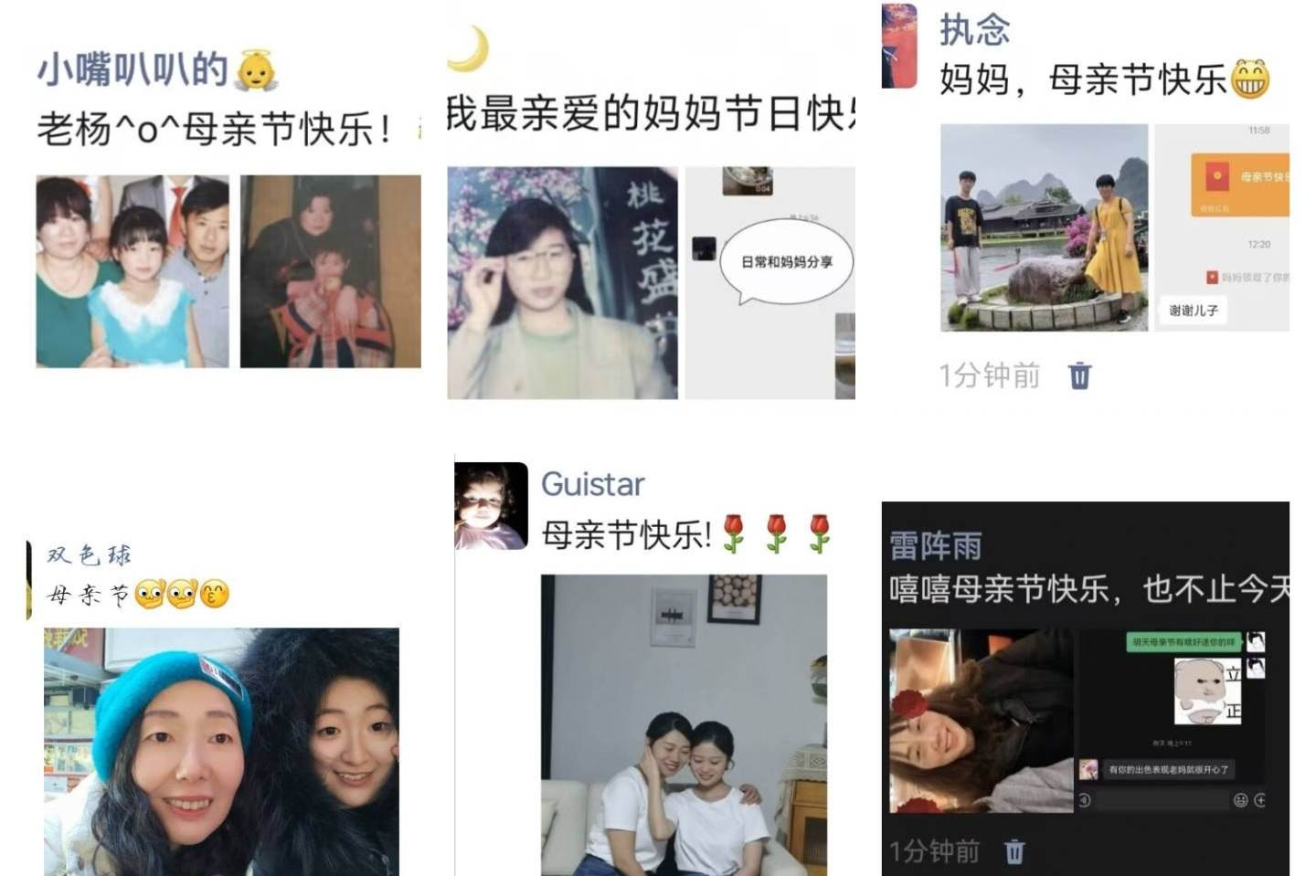 节日活动期间,同学们怀着感恩的心以线上的形式为相隔千里的母亲送上节日祝福,并将与母亲的合照及其礼物图片伴随祝福话语分享至朋友圈,勇敢的表达对母亲的爱意,同学们的行动使得节日整天弥漫着温馨的祝福。
