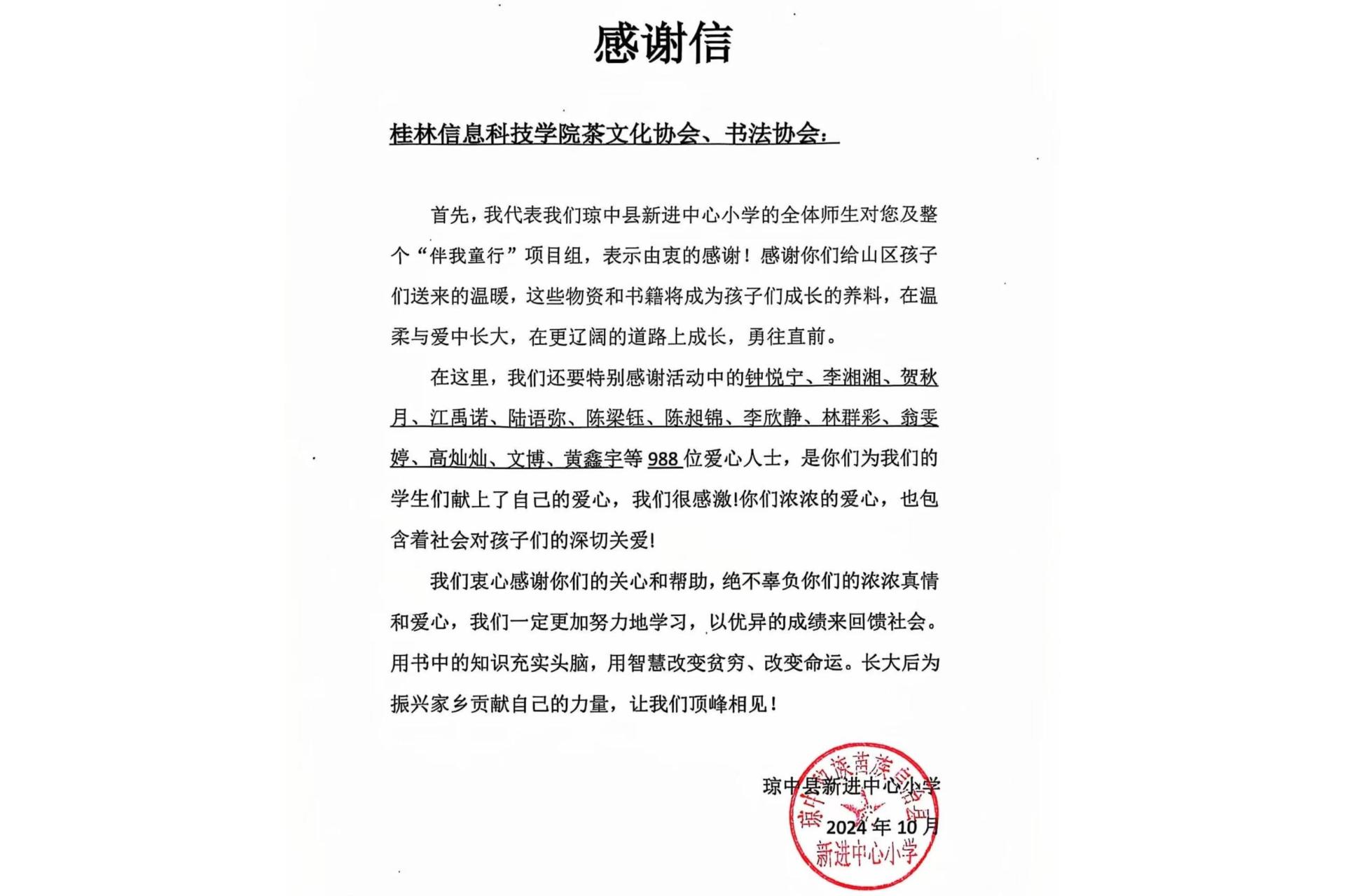 beat365官方网站茶文化协会与书法协会在2024年9-10月联合举办的“童心关爱,共沐书香”的公益活动圆满落幕。此次活动旨在通过积攒爱心值为贫困小学的孩子们捐赠书籍、通过小程序为孩子们书写寄语,鼓励他们努力学习。近日,beat365收到受捐学校琼中县新进中心小学感谢信、受捐证书以及孩子们的集体感谢视频。