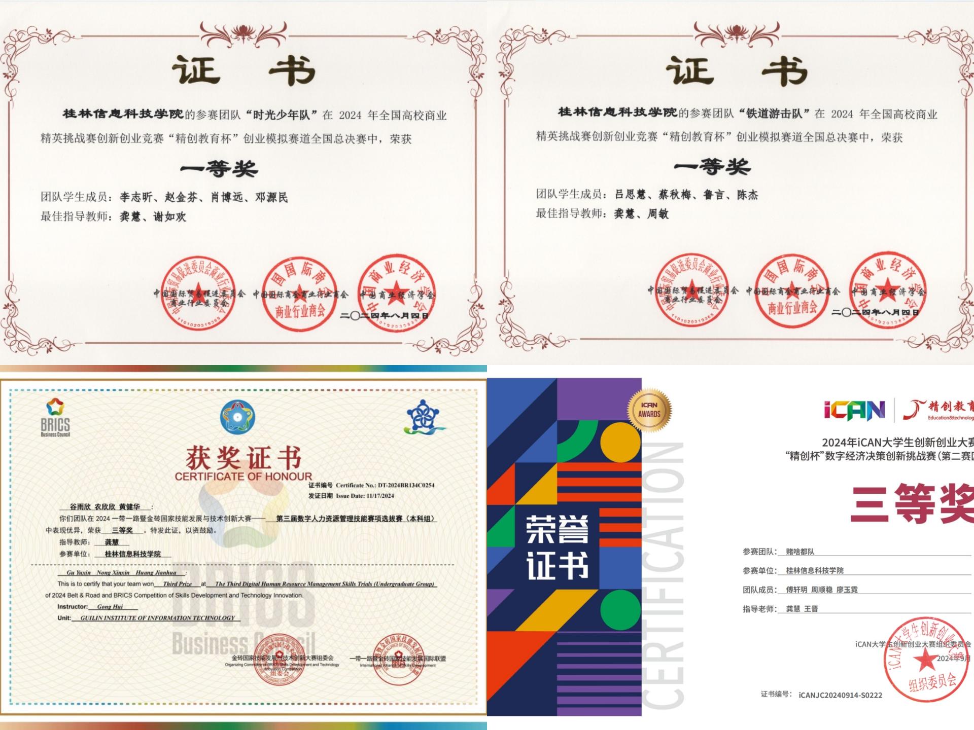 在过去的十年里,协会在全国各类竞赛中屡获佳绩,包括2024年全国高校商业精英挑战赛创新创业竞赛“精创教育杯”创业模拟赛道全国总决赛荣获一等奖6项,二等奖8项,三等奖4项;全国大学生人力资源管理知识竞赛(踏瑞杯)第二赛区获得一等奖2项,二等奖4项;2024“一带一路”暨金砖国家技能发展与技术创新大赛三等奖两项;全国HRD“精创教育杯”社团人力资源管理数字技能竞赛全国总决赛获特等奖2项,一等奖1项,二等奖1项;2024年iCAN大学生创新创业大赛“精创杯”数字经济决策创新挑战赛区赛三等奖2项等。