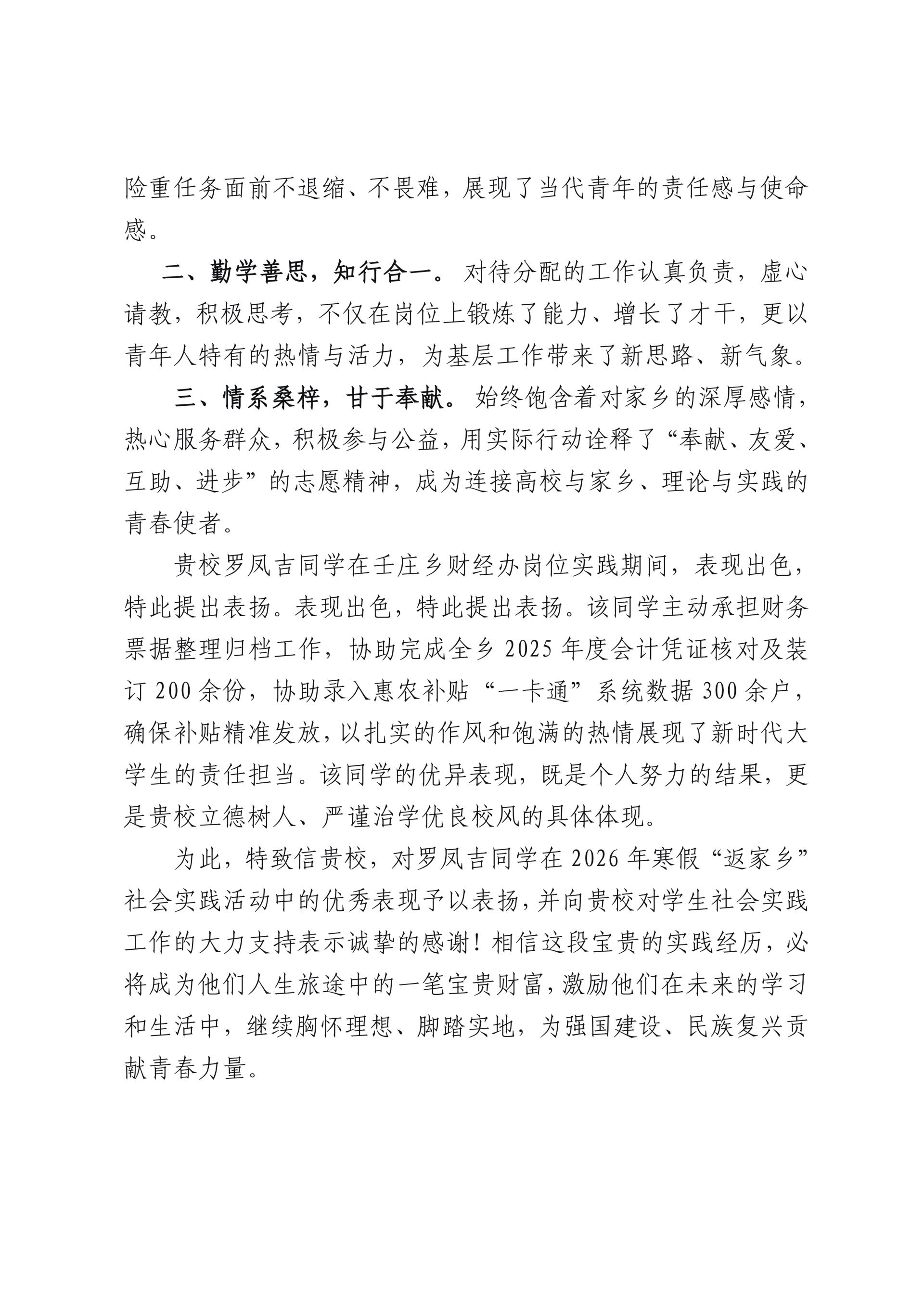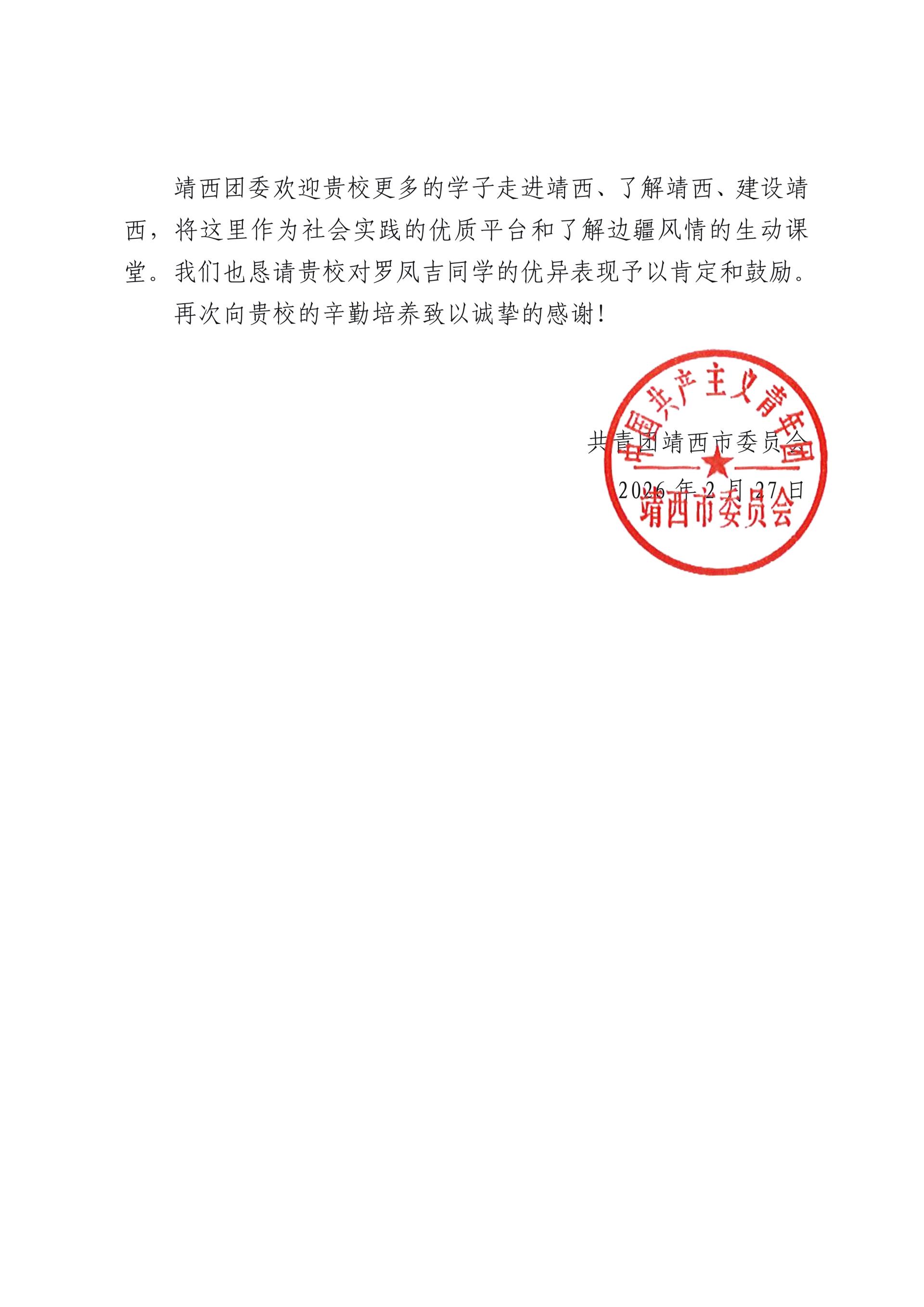 近日,beat365收到一封来自共青团靖西市委的表扬信,对商学院2023级财务管理学生罗凤吉参加当地2026年寒假“返家乡”社会实践活动中的突出表现给予了高度认可,向学校对大学生社会实践工作的大力支持致以诚挚感谢。
