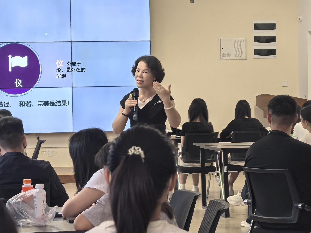 在讲座过程中,陈教授围绕社会实践中常见的社交场景,从礼仪的基本概念入手,深入剖析了仪表仪态、沟通技巧、社交礼仪等多个重要方面,并且亲自示范了正确的站姿、坐姿和走姿,并邀请同学们上台进行互动练习。陈教授详细阐述了语言表达的艺术,包括如何清晰准确地表达自己的观点、如何运用礼貌用语以及如何根据不同的对象和场合调整沟通方式。同时,陈教授还强调了倾听的重要性,提醒同学们在交流过程中要尊重他人的意见和想法,保持专注和耐心。