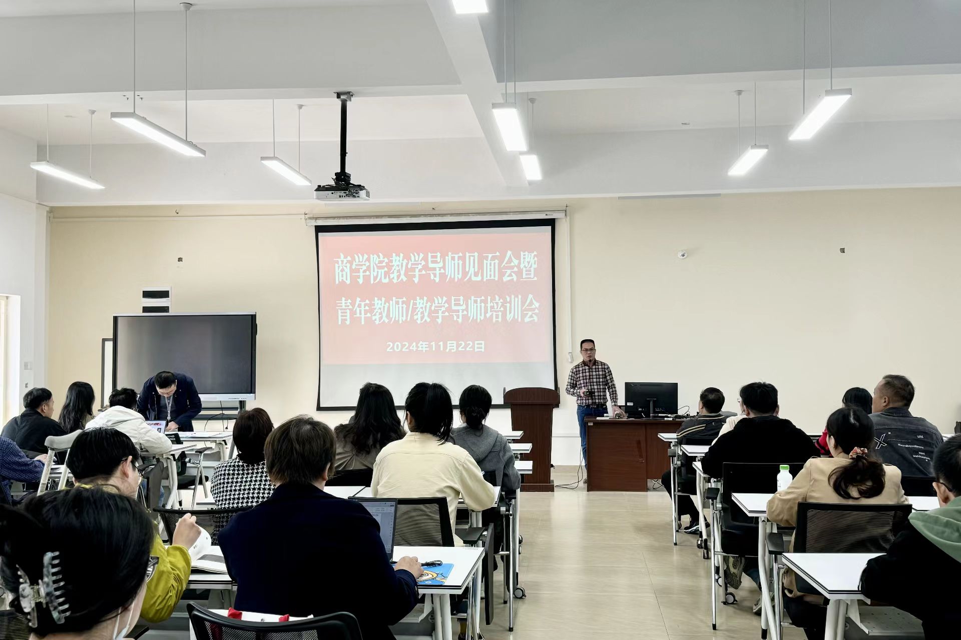 2024年11月22日下午13:30,商学院在博文楼F407教室召开青年教师教学导师见面会及培训会。此次会议旨在加强青年教师队伍建设,提升青年教师的教学能力和专业素养,通过教学导师的悉心指导,助力青年教师快速成长。