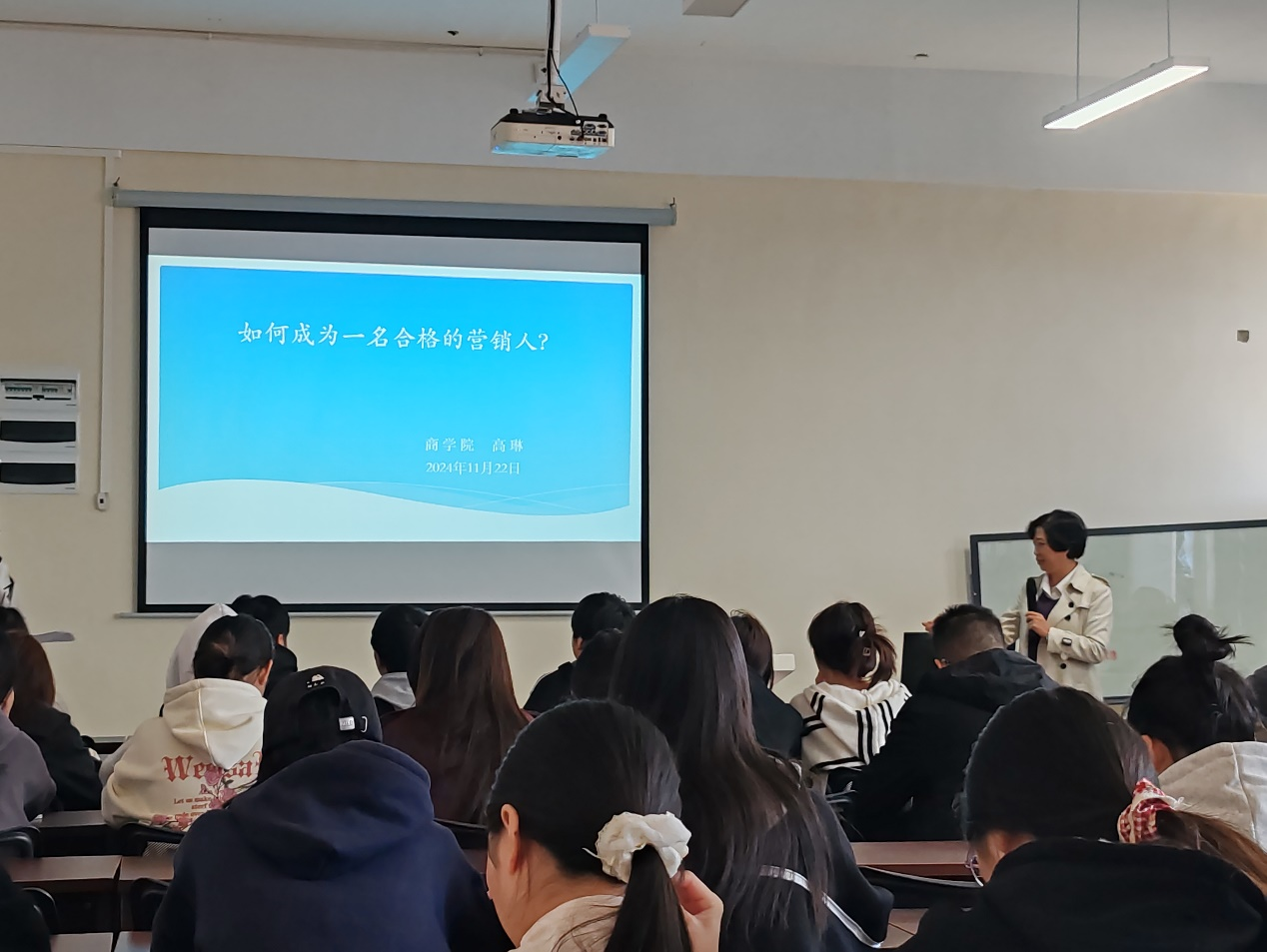 讲座中,高琳副教授指出在当今这个信息爆炸的时代,营销人员面临的挑战日益严峻,只有不断提升自己的专业素养和综合能力,才能在激烈的市场竞争中脱颖而出。随后,她围绕“如何成为一名合格的营销人”这一主题,从多个角度进行了深入剖析。她强调,一名合格的营销人必须具备良好的思想道德素质,能够坚守职业道德底线,未来不为一时之利而损害客户或公司的利益。在大学学习期间要练就好的口才,提升沟通表达能力,增强创新意识,开阔职业发展思路。