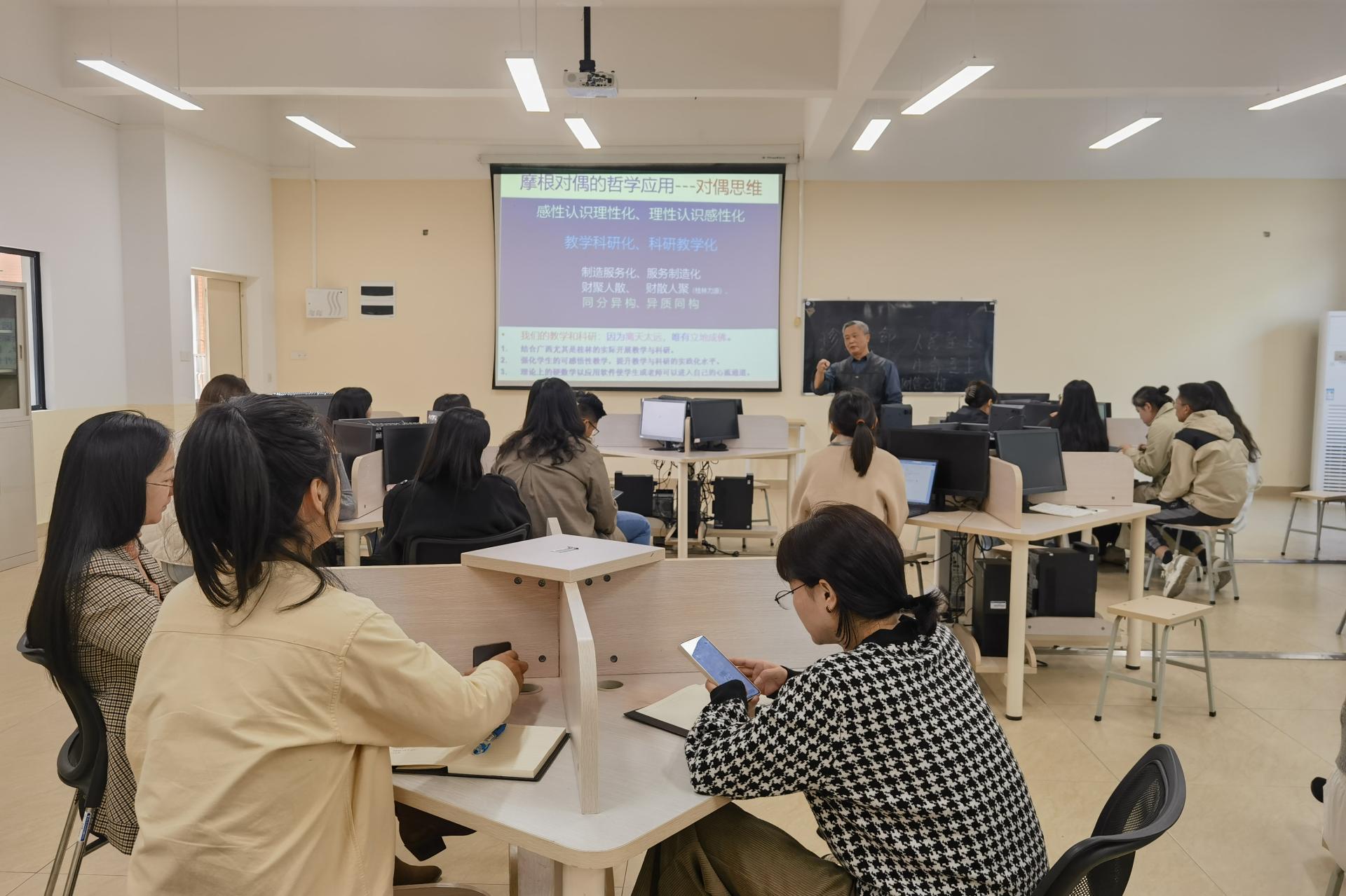 紧接着,秦教授详细阐述了“教学科研化”与“科研教学化”的理念。他强调,这两者并非简单的互换,而是相互融合、相互促进的过程。秦教授展示了对偶思维的几种观点,如“感性知识理性化和理性知识感性化”、“制造服务化和服务制造化”、“财聚人散和财散人聚”、“同分异构和异质同构”等,并运用各类实践案例指导现场教师如何贴近广西和桂林的实际开展教学与科研,将看似对立的元素在教学与科研中有机结合,从而创造出新的价值。在讲座的后半部分,秦教授特别强调了利用先进软件工具提升教学效果的重要性。他介绍了一些在教学和科研中常用的软件工具,如数据分析软件、在线教学平台等,并分享了如何有效地利用这些工具来提高教学和科研效率。