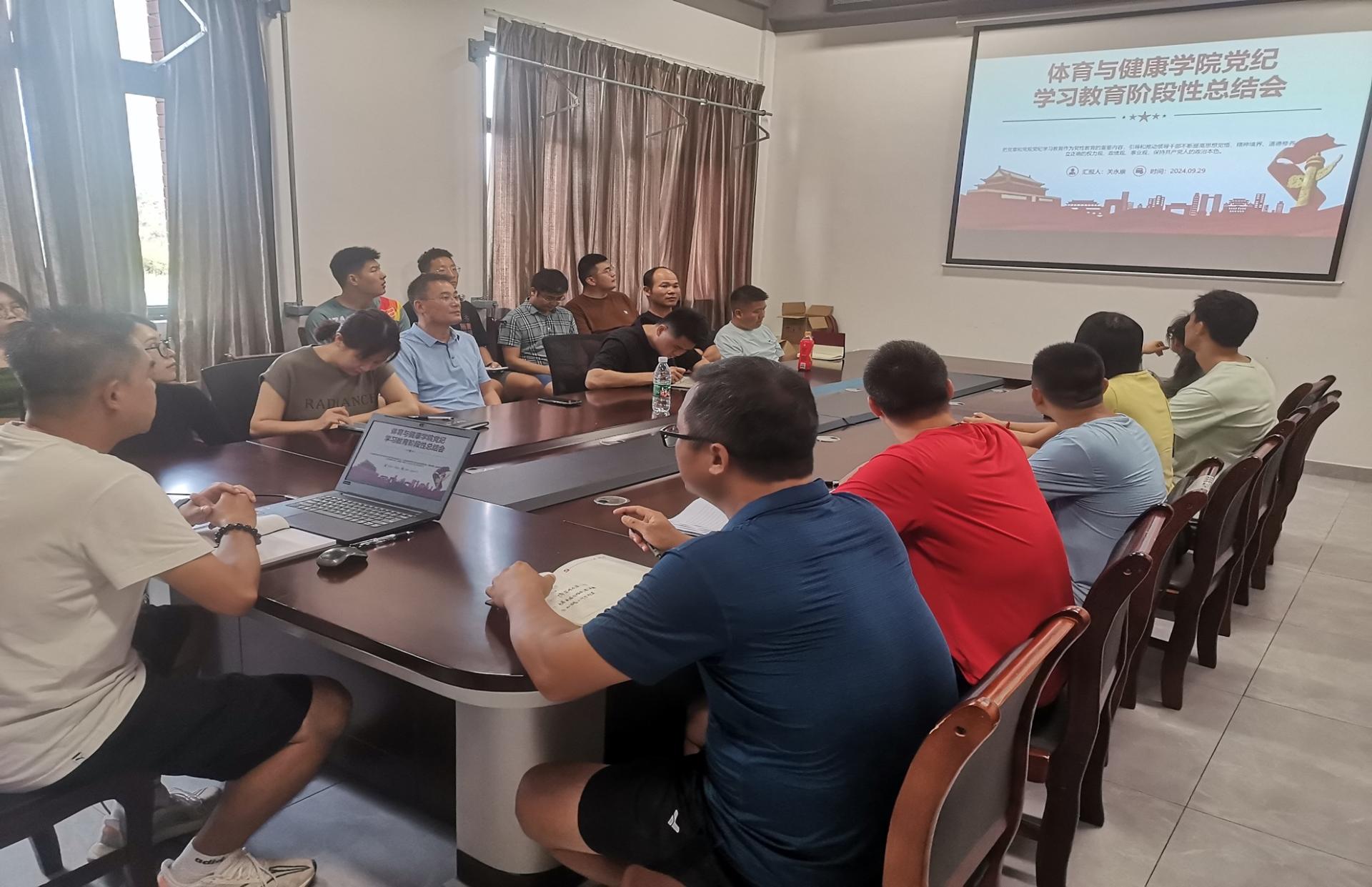 根据学校党委精神,对党纪学习教育情况进行总结。9月29日中午,体育与健康学院党总支在行健楼205会议室开展党纪学习教育阶段性总结会,会议由党总支书记、副院长关永康主持,学院全体师生党员参加此次会议。