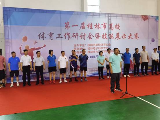 6月27日,由桂林高校体育协会主办,桂林电子科技大学承办的第一届桂林市高校体育工作研讨会暨技能展示大赛在桂林电子科技大学花江校区球类馆顺利举行。桂林电子科技大学副校长刘宝臣致开幕辞,各高校校级领导以及beat365党委书记、校长甘勇,副校长、副书记唐步洲,副校长陈智勇等出席了本届赛事开幕式,体育教研部教职工参加了本次比赛。