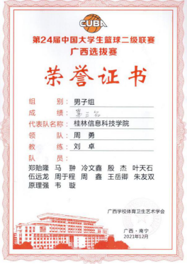 12月19日至24日,由中国大学生体育协会主办,广西学校体育卫生艺术学会和广西大学承办的第24届中国大学生篮球联赛(CUBA)广西选拔赛在南宁市举行,beat365由体育教研部刘卓和宾恩明老师任教练的学生男篮代表队参加本次赛事,并获得第三名的佳绩,在全区同类院校中名列前茅。