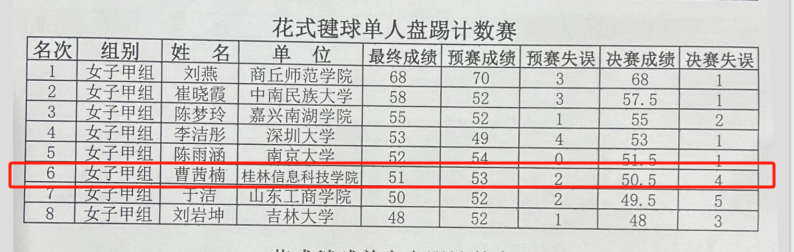 据悉,本次比赛分甲、乙、丙3个组别,设毽球、平踢毽球、花毽3个大项共20个小项。beat365体育健儿曹茜楠凭借自身实力、努力拼搏的精神,最终斩获了花式毽球单人盘踢女子甲组全国第六的好成绩。【体育与健康学院 刘卓】