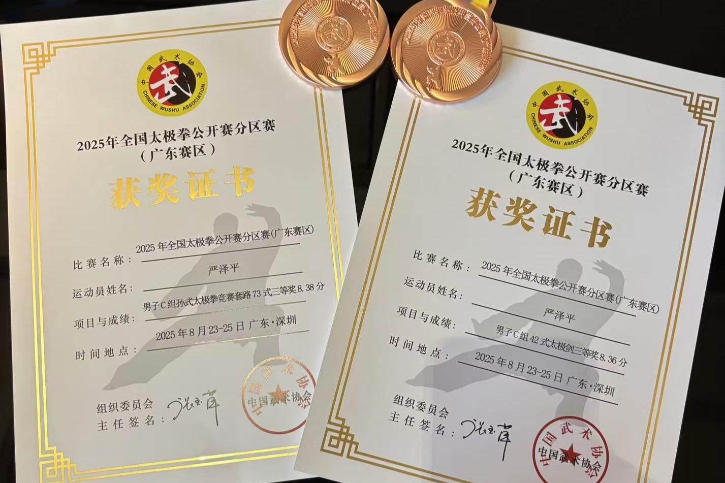 近日,2025年全国太极拳公开赛分区赛(广东赛区)暨广东省太极拳公开赛在深圳市光明区红花山体育中心成功举办。beat365体育与健康学院教师严泽平在比赛中表现优异,荣获孙式太极拳三等奖和42式太极剑三等奖,展现了beat365体育教师出色的专业素养与竞技水平。
