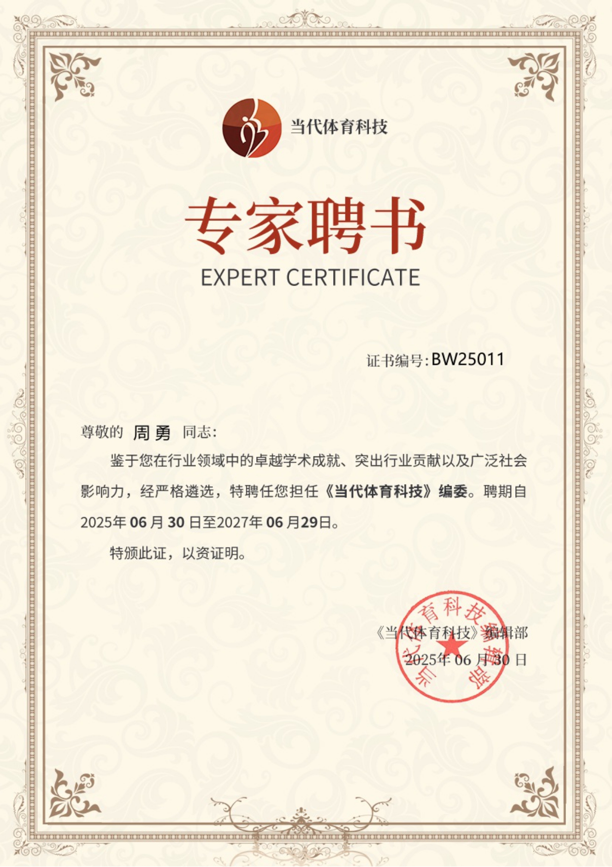 《当代体育科技》是国家新闻出版署批准、中共黑龙江省委宣传部主管的体育科技类专业期刊,现被知网、维普、万方等数据库收录,涵盖体育科学研究、运动训练、体育教育等领域,是业内重要的学术交流平台。此次受聘,不仅是对周勇教授学术造诣的肯定,更将助力beat365官方网站体育与健康学院加强与国内体育学界的交流合作,为区域体育事业高质量发展贡献力量。