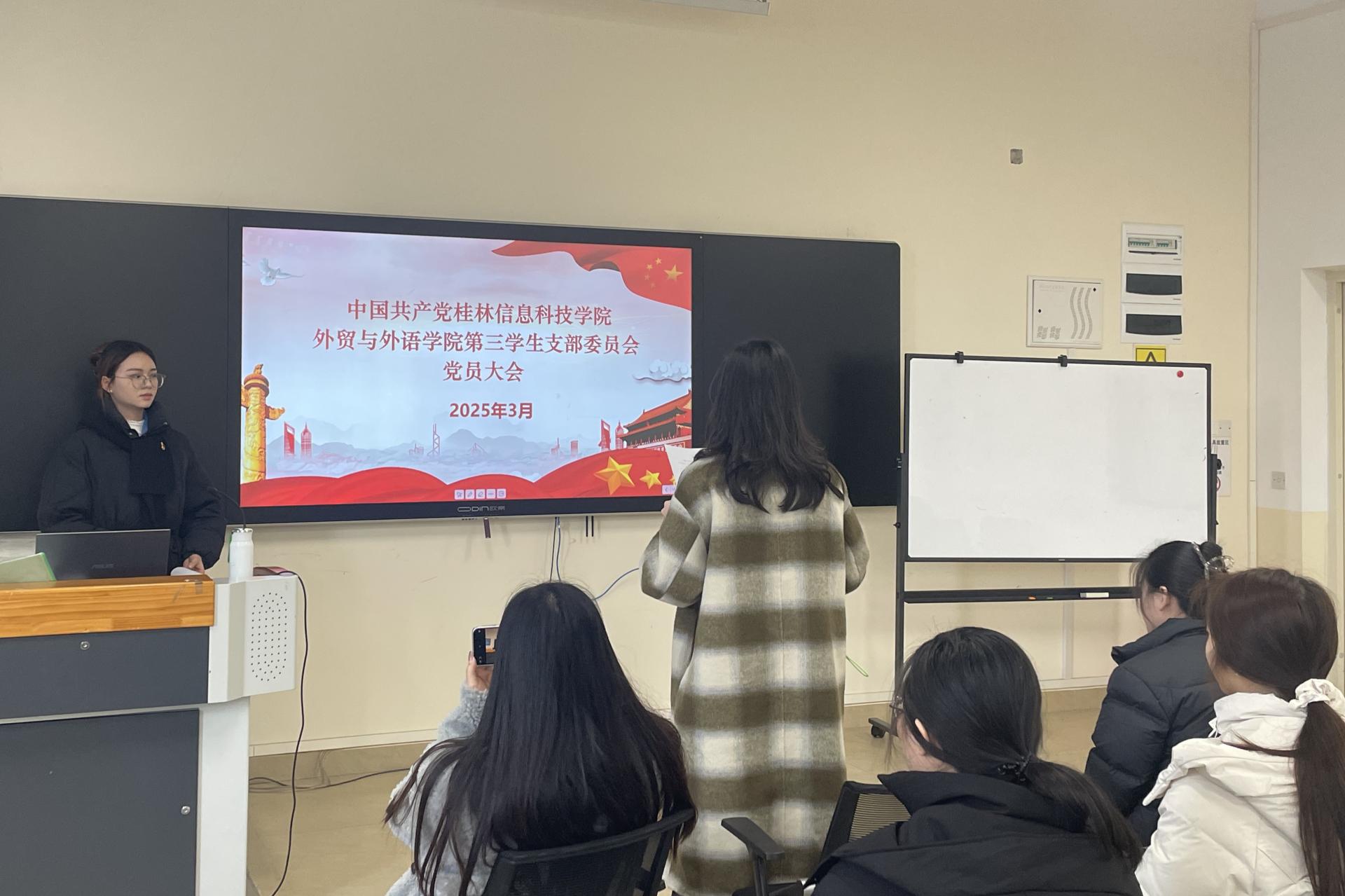 为加强基层党组织建设,依据《中国共产党章程》和《中国共产党基层组织选举工作条例》及相关规定,经党委批准,外贸与外语学院第三学生党支部于2025年3月7日在博文楼F213举行党员大会,对第一届支部委员会成员进行选举。会议由学院第三学生党支部书记张慧芳同志主持,外贸与外语学院第三学生党支部全体党员参加。
