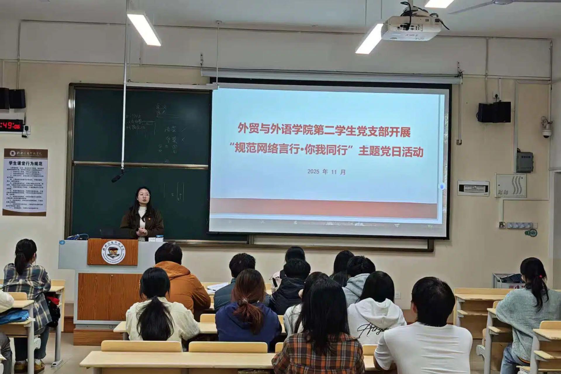为深入推进新时代文明实践站建设,打造特色文明实践案例,切实提升党员网络素养,2025年11月5日,外贸与外语学院学生党支部在D205教室开展“规范网络言行·你我同行”主题党日活动。外贸与外语学院第二学生党支部支书尹凌云主持,第一、第三学生党支部书记,全体学生党员、发展对象以及入党积极分子参与学习。