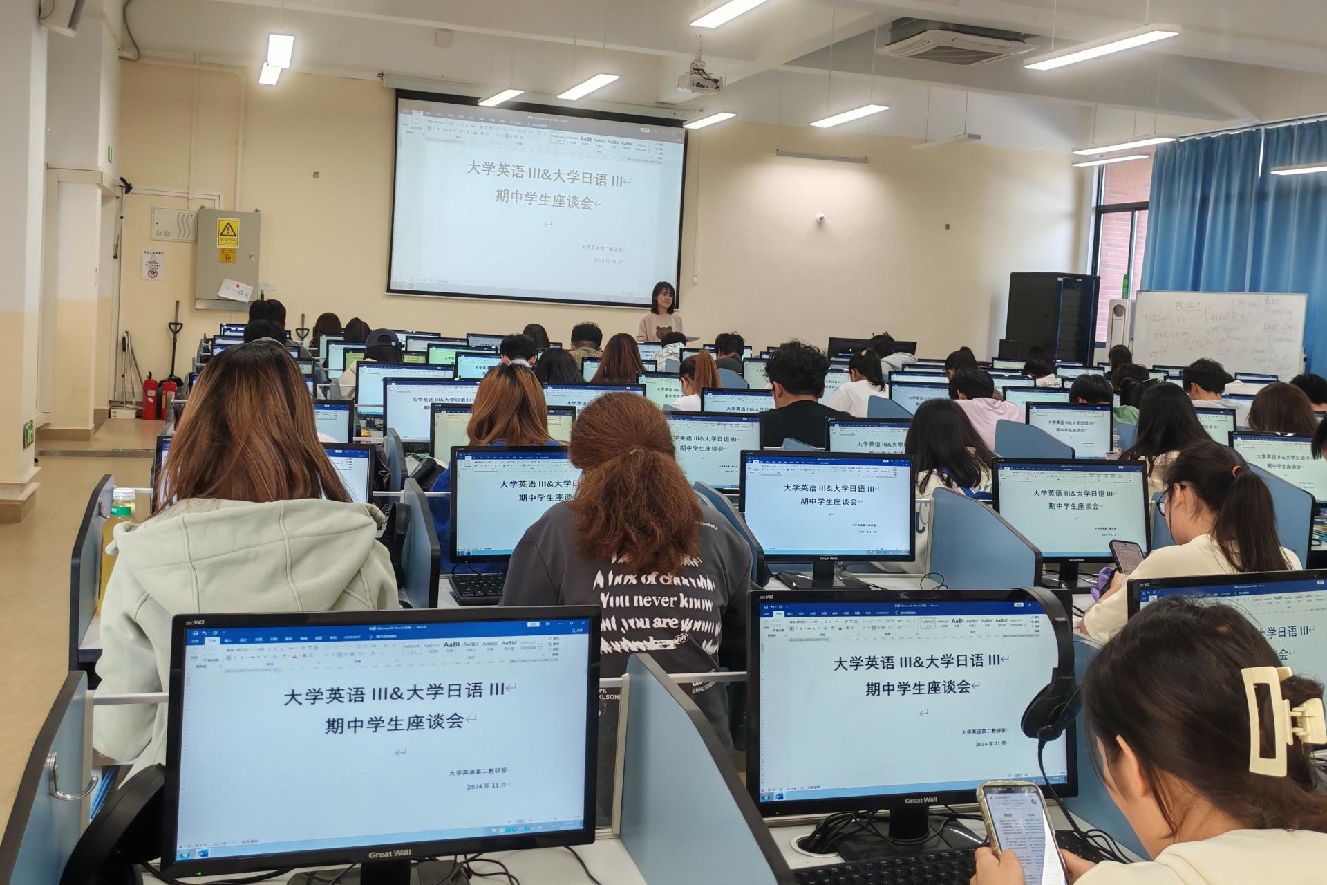 为进一步提升大学英语和大学日语课程的教学教风建设、教学管理建设及教学水平,外贸与外语学院大学英语教研室于11月11日在F111、F101召开期中教师线上座谈会以及学生线下座谈会,大学英语和大学日语课程全体任课教师及各课号学生代表参加。