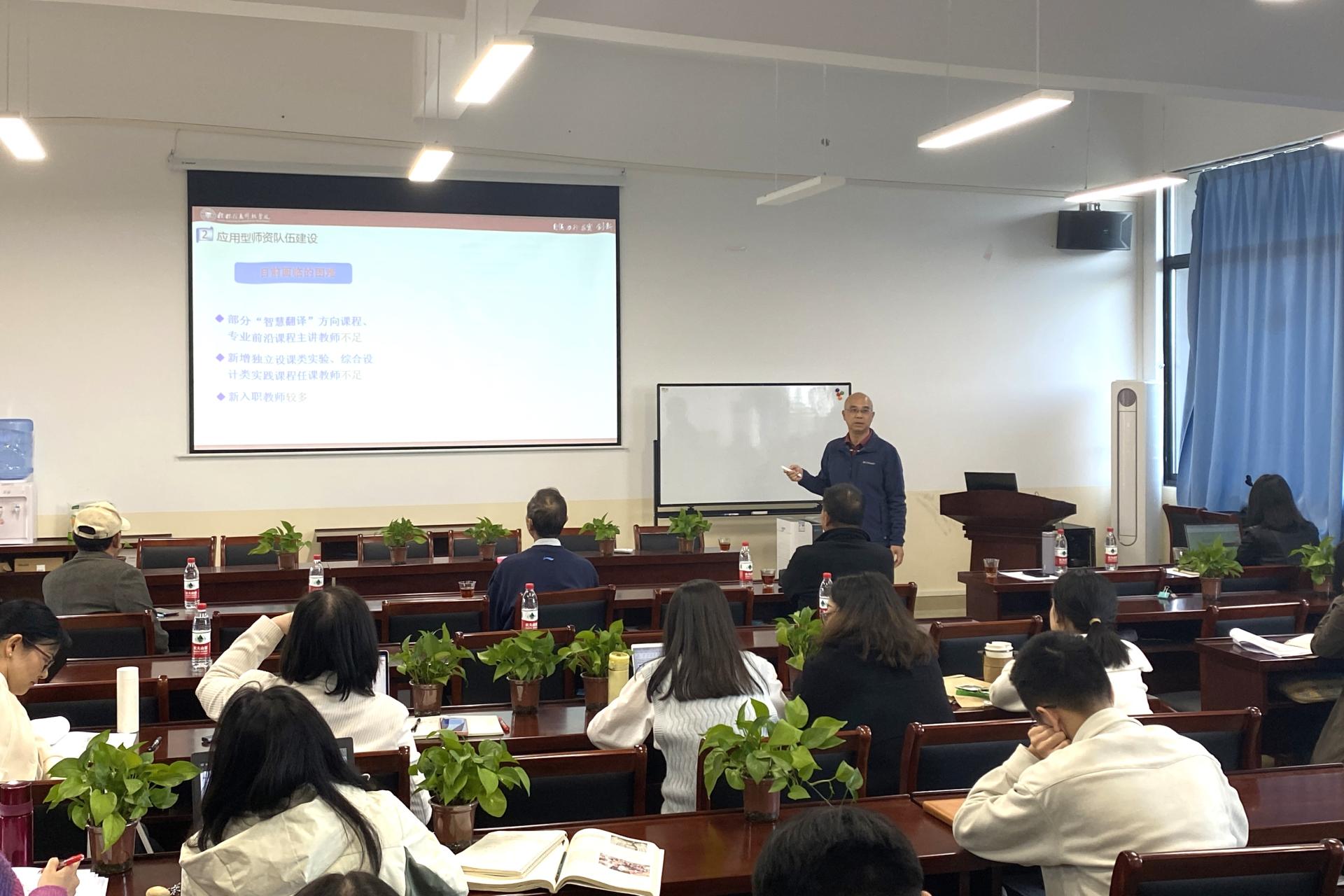 近日,外贸与外语学院成功举办了评建“六说”活动。此次活动由学院精心策划,旨在通过“六说”的形式,汇聚专业带头人及广大教师,共同探讨专业建设思路、教学质量提升与教师专业素养增强等重要问题。此次活动由学院副院长陆晓主持,全体教师参加。