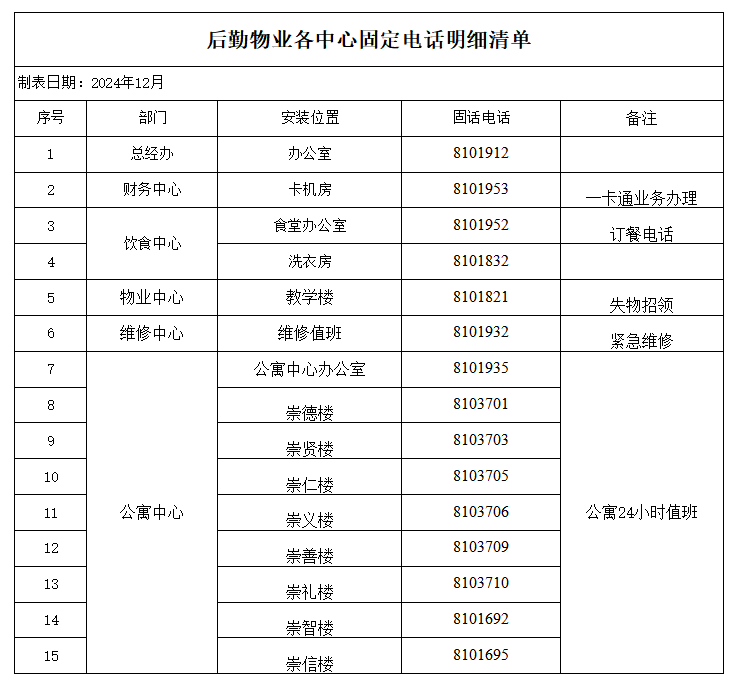 后勤服务处各中心固定电话明细清单