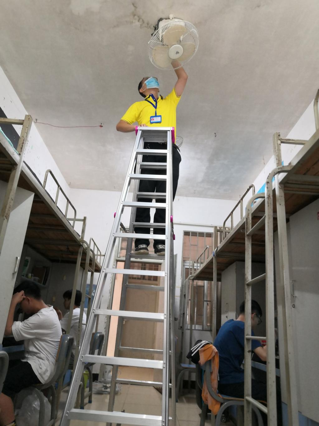 维修师傅们顶着炎炎烈日、坚守岗位,维修更换后山篮球场、足球场泛光灯28盏,更换生活区照明灯120,为全校921个给、排水井盖刷标识漆,完成557间新生宿舍维修及空调、风扇的清洗,并配合、跟踪校内箱变、热水机组、中央空调等大型设备维保工作,为保障开学后各项工作开展做好准备。