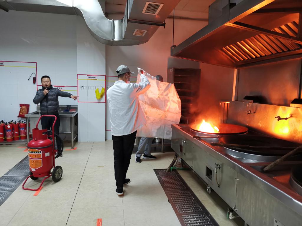 万金辉结合实际案例讲述了消防安全的重要性,并通过详细讲解灭火器的使用方法、注意事项,并根据食堂工作特性着重讲解油锅起火的处理方式,演练中合理利用灭火毯、灭火盖、灭火器这些消防器械灭火,最后组织员工进行疏散演练。