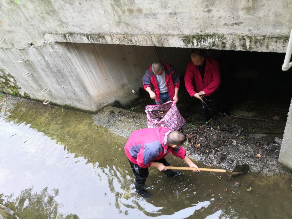 在冲沟清淤现场,维修员工不顾恶臭、雨淋,下到冲沟排水口,一丝不苟地将沟内淤泥、生活垃圾等清理干净,切实做好主汛期到来时校内排水顺畅工作,确保了校园安全稳定。