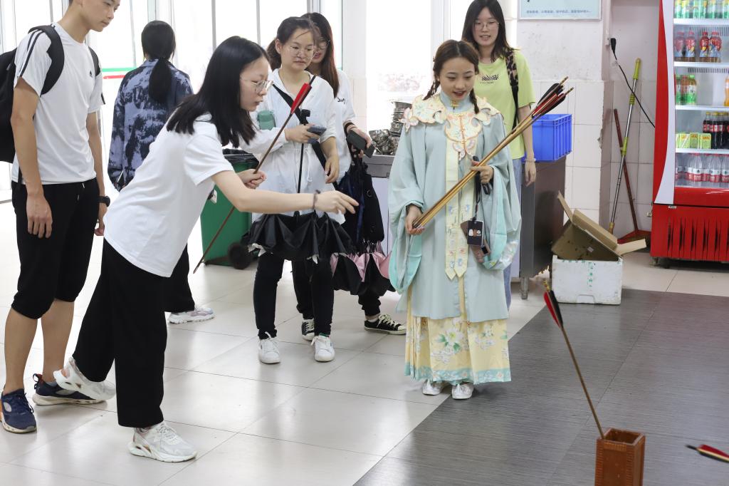 信科食堂将现代元素融入传统文化,通过寓教于乐的方式,搭建“服务育人”的活动平台,将活动分为“光盘有礼”、“传统投壶”、“体验包粽子”三个模块,师生凭就餐“光盘”或命中投壶,即可玩转幸运转盘一次,获得粽子、艾叶香囊、鸡蛋、鲜果等对应的礼品。汉服社团的同学们身着汉服为活动现场助兴,吸引不少师生驻足参与,活动现场热闹欢快。