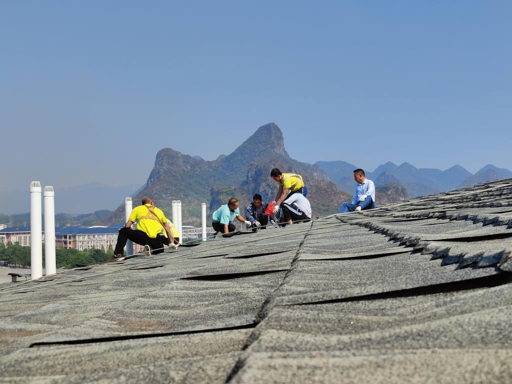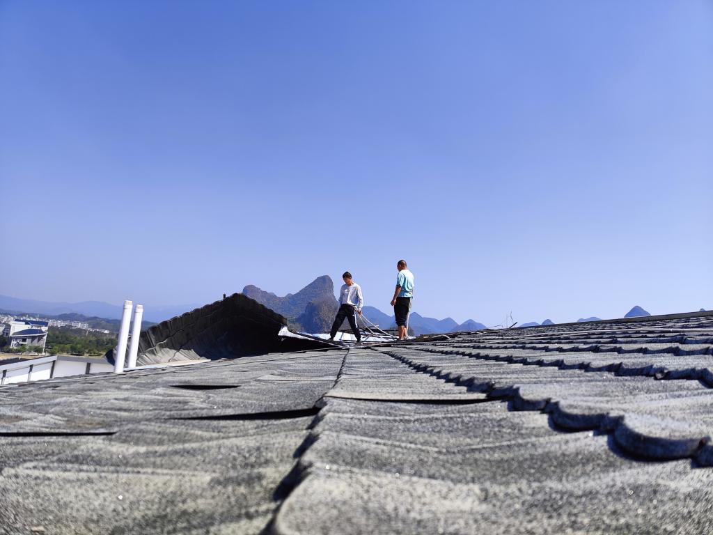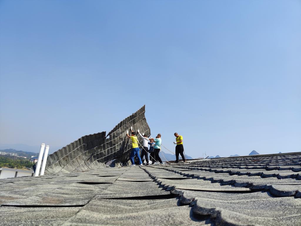 时间紧、任务重,涉及高空作业、大风天气等诸多不利条件给抢修工作带来了极大的困难。为了尽快排除安全隐患,中心员工在做好防护措施的前提下,铆足干劲、齐心协力,爬上楼顶将脱落的铁皮瓦片进行固定和拆除,用坚韧负责的行动圆满完成抢修任务。